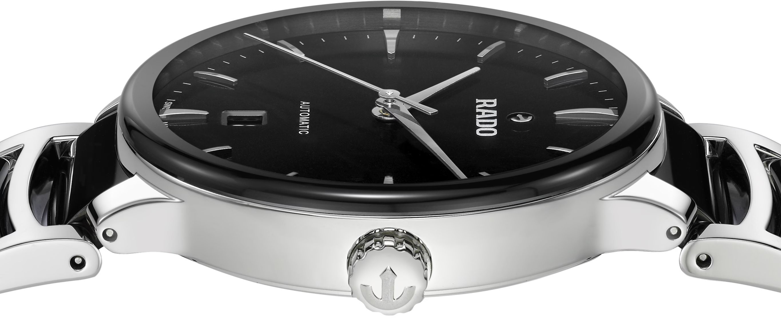 Rado Centrix Automatic R30018152 sú automatické unisex hodinky elegantného štýlu s oceľovým puzdrom s priemerom 39,5 milimetra. Náramok tvorí kombinácia materiálu High-Tech Ceramic a ocele. Čierny číselník s dátumovkou na šiestej hodine je chránený tzv. „edge to edge“ zafírovým sklom s metalizovaným rámčekom, ktoré siaha až k úplnému okraju puzdra.  Priehľadné viečko umožňuje pohľad na automatický kaliber R763 (03.763.242) dekorovaný ženevskými pruhmi a perlážou. Tento mechanický strojček s automatickým náťahom a rezervou chodu 80 hodín disponuje funkciou hackingu (zastavenie sekundovej ručičky pri vytiahnutí korunky do krajnej polohy) a je možné ho v prípade potreby naťahovať aj ručne. Vďaka použitiu antimagnetického vlásku zotrvačky Nivachron™ z titánovej zliatiny je tento kaliber vysoko odolný voči vplyvom magnetického poľa. Pre dosiahnutie čo najvyššej možnej presnosti je stroj testovaný v piatich pozíciách. Hodinky disponujú vodotesnosťou 5 ATM a sú teda odolné proti dažďu a pri sprchovaní.