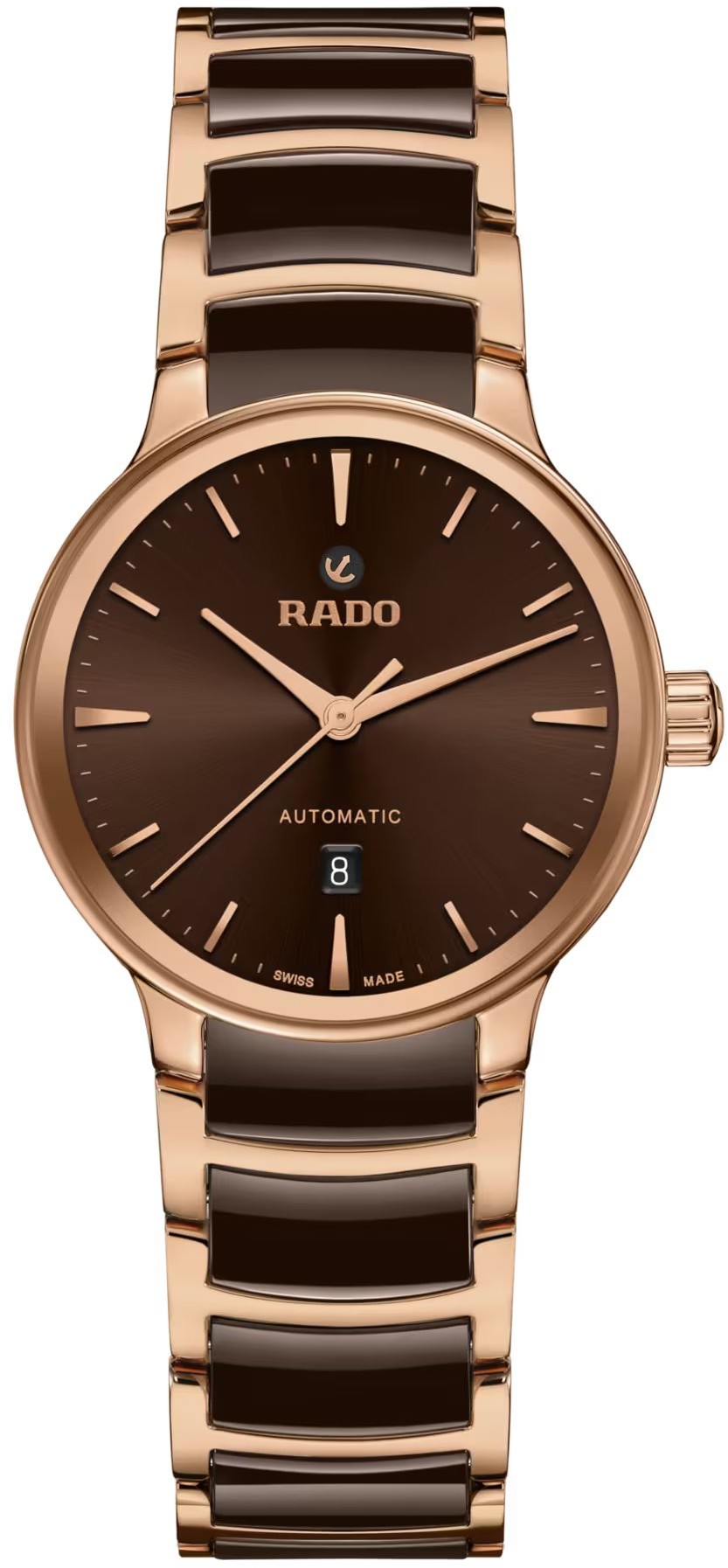 Rado Centrix Automatic R30019302 sú dámske automatické hodinky elegantného štýlu s oceľovým puzdrom s priemerom 30,5 milimetra. Náramok tvorí kombinácia materiálu  High-Tech Ceramic a ocele. Puzdro s korunkou a oceľové časti náramku sú ošetrené PVD úpravou vo farbe ružového zlata. Hnedý číselník s dátumovkou na šiestej hodine je chránený tzv. „edge to edge“ zafírovým sklom s metalizovaným rámčekom, ktoré siaha až k úplnému okraju puzdra.  Priehľadné viečko umožňuje pohľad na automatický kaliber R582 (03.582.432) dekorovaný ženevskými pruhmi a perlážou. Tento mechanický strojček s automatickým náťahom a rezervou chodu 48 hodín disponuje funkciou hackingu (zastavenie sekundovej ručičky pri vytiahnutí korunky do krajnej polohy) a je možné ho v prípade potreby naťahovať aj ručne. Vďaka použitiu antimagnetického vlásku zotrvačky Nivachron™ z titánovej zliatiny je tento kaliber vysoko odolný voči vplyvom magnetického poľa. Pre dosiahnutie čo najvyššej možnej presnosti je stroj testovaný v piatich pozíciách. Hodinky disponujú vodotesnosťou 5 ATM a sú teda odolné proti dažďu a pri sprchovaní.