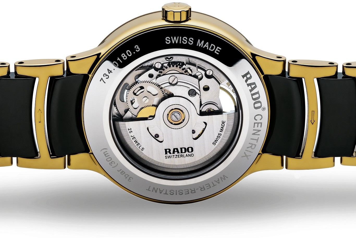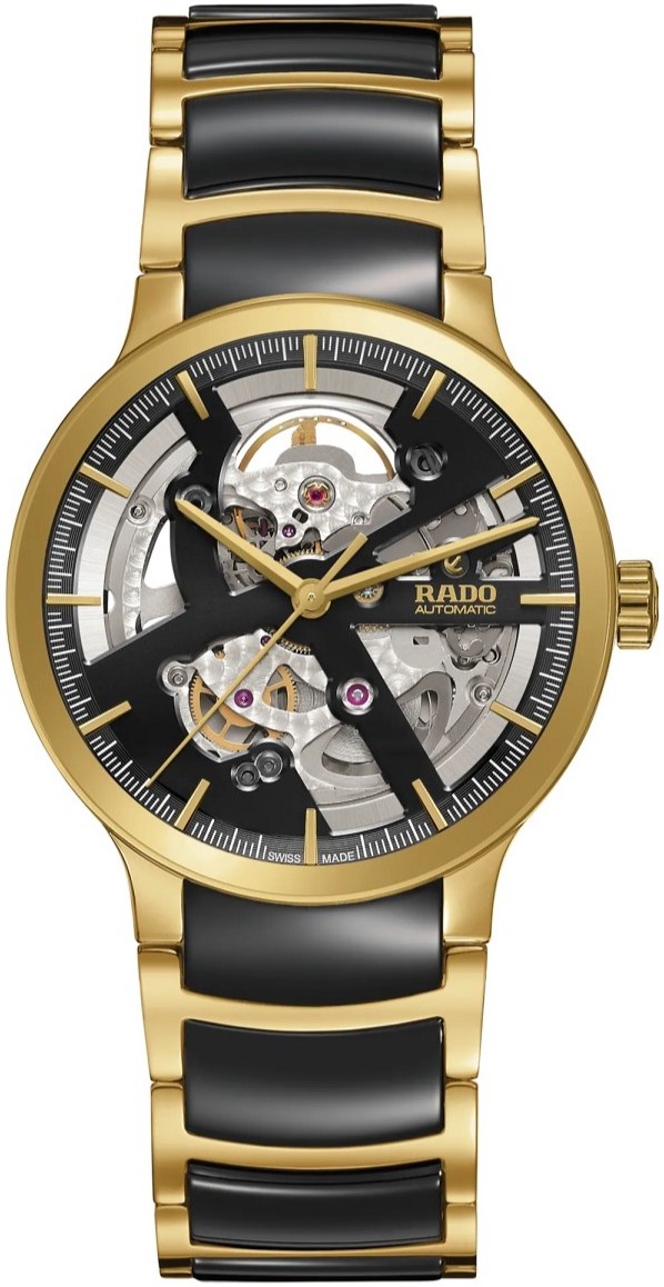 Rado Centrix R30180162 sú automatické unisex hodinky elegantného štýlu s lešteným oceľovým puzdrom s priemerom 38 milimetrov. Náramok tvorí kombinácia keramického materiálu High-Tech Ceramic a ocele s titánovou motýlikovou sponou. Puzdro s korunkou a oceľové časti náramku sú opatrené PVD úpravou v zlatej farbe. Čierny skeletónový číselník je chránený tzv. „edge to edge“ zafírovým sklom s metalizovaným rámčekom, ktoré siaha až k úplnému okraju puzdra. Spolu so zafírovým priehľadným viečkom ponúka pohľad na mechanický strojček s automatickým náťahom R734 (03.734.431), ktorý je dekorovaný perlážou a ženevskými pruhmi. Tento strojček s rezervou chodu 80 hodín disponuje funkciou hackingu (zastavenie sekundovej ručičky pri vytiahnutí korunky do krajnej polohy) a je možné ho v prípade potreby naťahovať aj ručne. Vďaka použitiu antimagnetického vlásku zotrvačky Nivachron™ z titánovej zliatiny je kaliber vysoko odolný voči vplyvom magnetického poľa. Na dosiahnutie čo najvyššej možnej presnosti je stroj testovaný v piatich pozíciách. Hodinky disponujú vodotesnosťou 3 ATM a sú teda odolné proti vlhkosti, dažďu a pri umývaní rúk.
