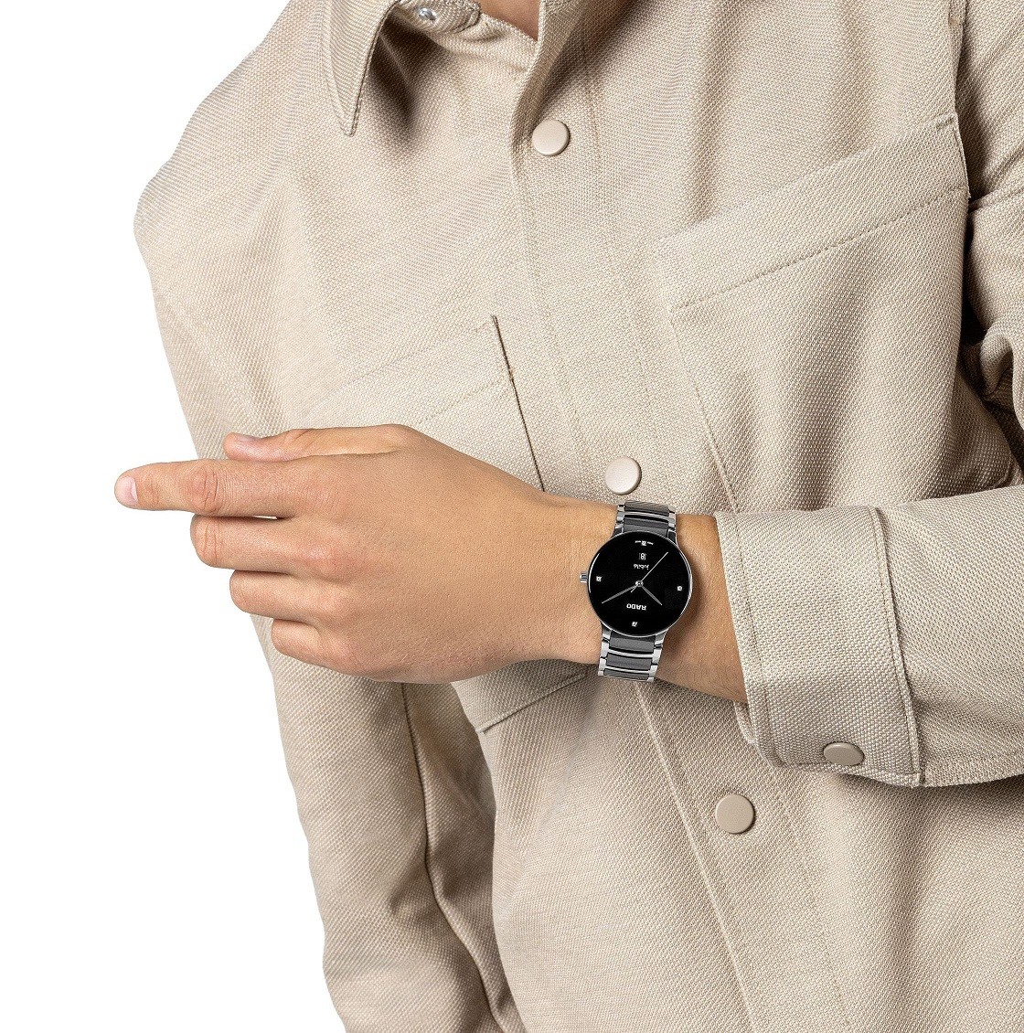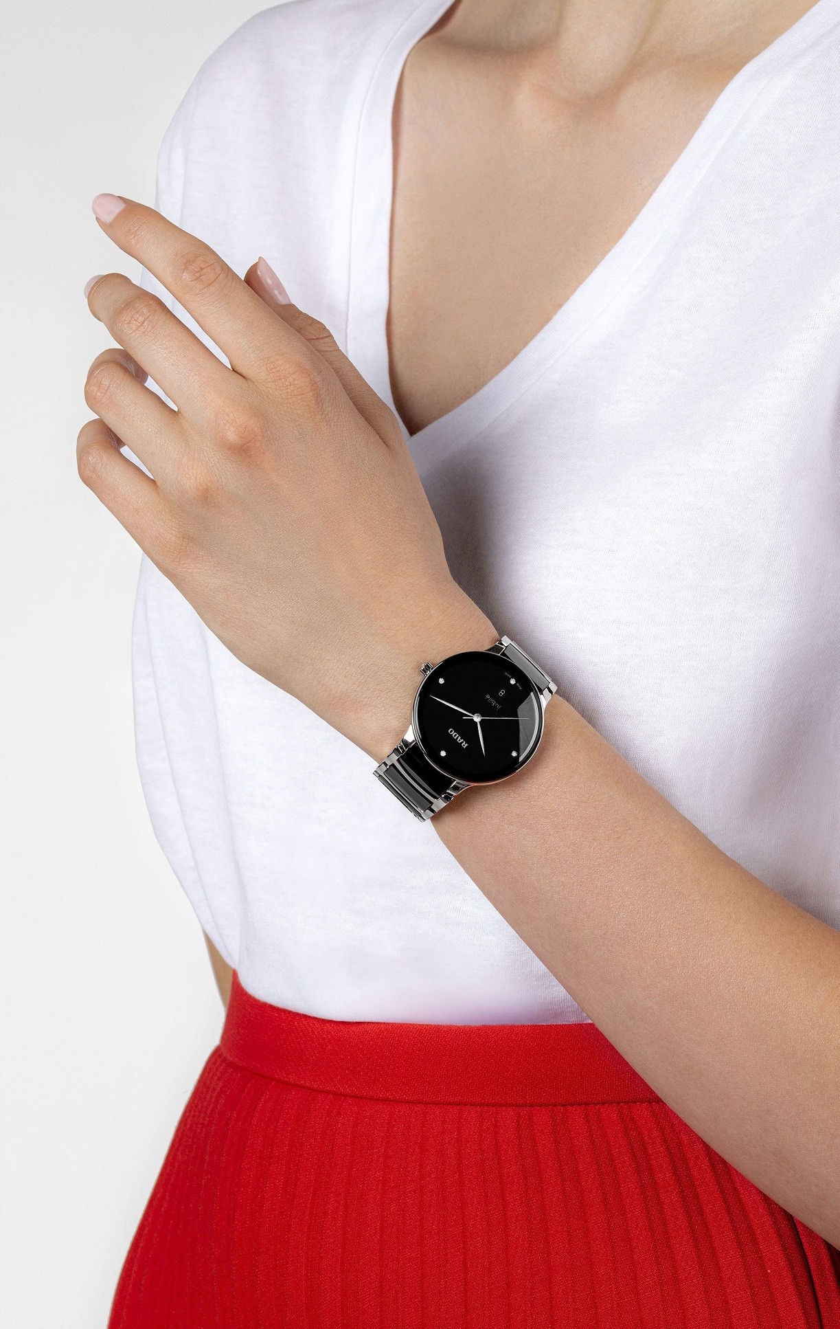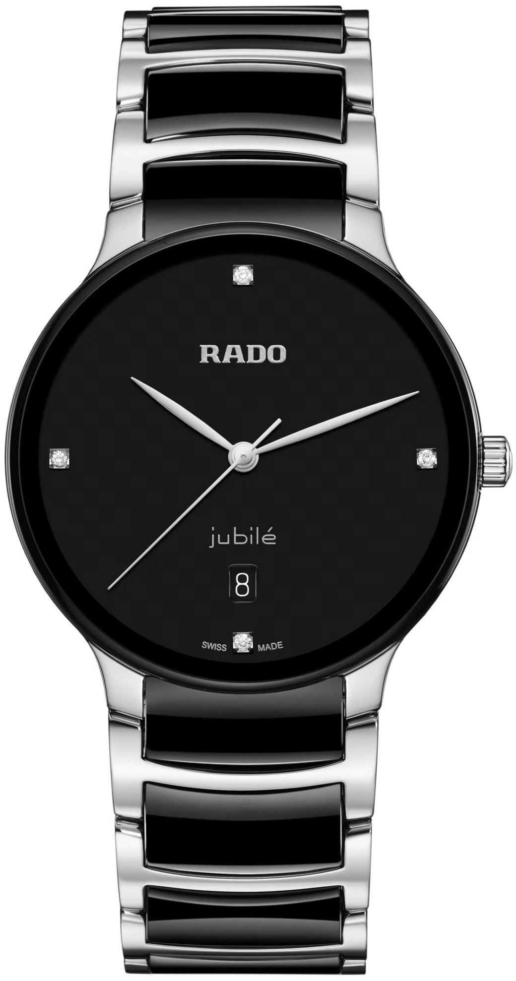Rado Centrix Diamonds R30021712 sú batériové unisex hodinky elegantného štýlu s oceľovým puzdrom s priemerom 39,5 milimetra. Náramok tvorí kombinácia materiálu High-Tech Ceramic a ocele. Čierny číselník s dátumovkou zdobený 4 diamantmi je chránený tzv. „edge to edge“ zafírovým sklom s metalizovaným rámčekom, ktoré siaha až k úplnému okraju puzdra. Pohon hodiniek zaisťuje švajčiarsky quartzový strojček. Hodinky disponujú vodotesnosťou 5 ATM a sú teda odolné proti dažďu a pri sprchovaní.