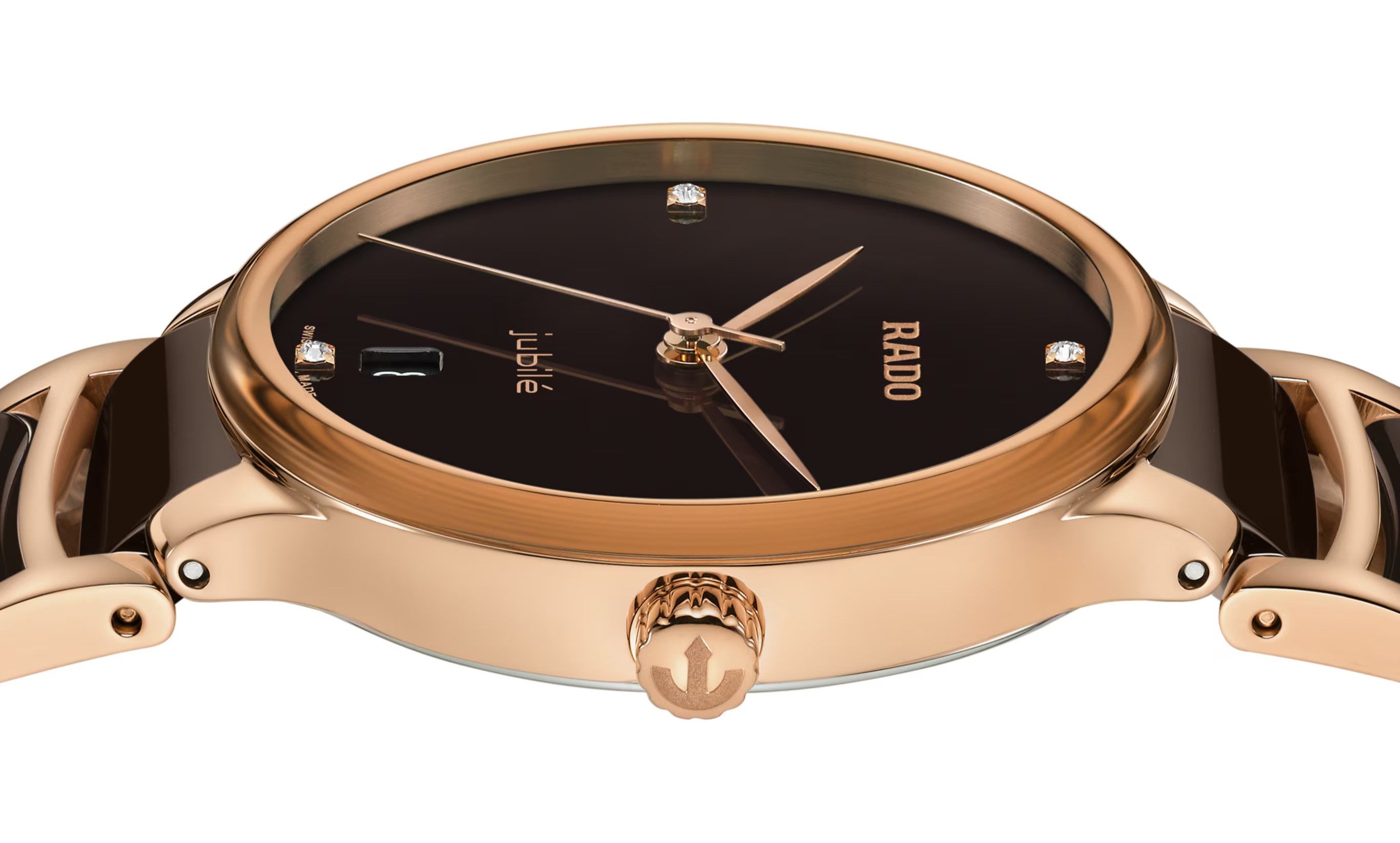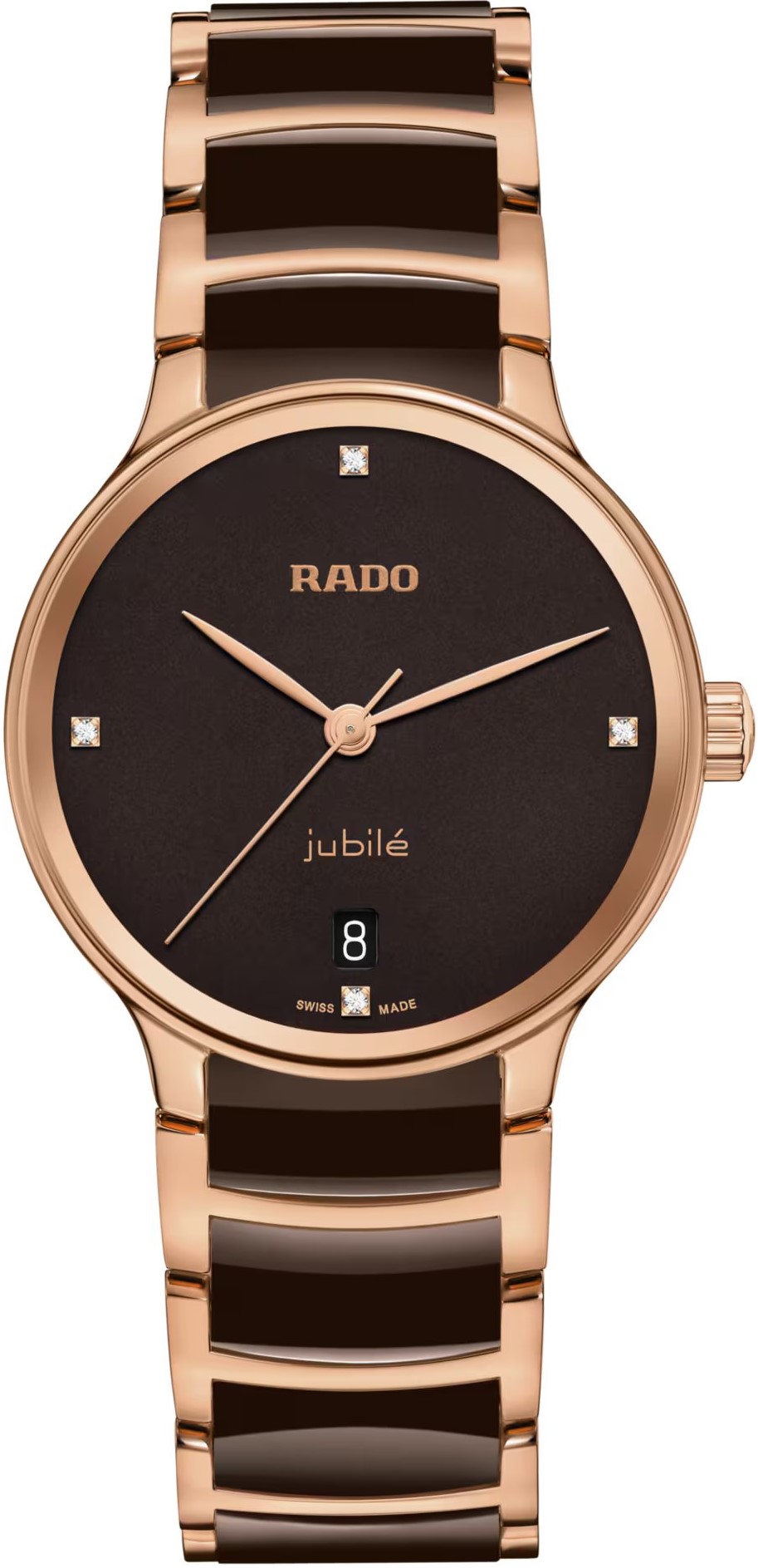 Rado Centrix Diamonds R30038712 sú dámske batériové hodinky elegantného štýlu s oceľovým puzdrom s priemerom 35 milimetrov. Náramok tvorí kombinácia materiálu High-Tech Ceramic a ocele s PVD úpravou vo farbe ružového zlata. Hnedý číselník s dátumovkou na šiestej hodine zdobený 4 diamantmi je chránený tzv. „edge to edge“ zafírovým sklom s metalizovaným rámčekom, ktoré siaha až k úplnému okraju puzdra. Pohon hodiniek zaisťuje švajčiarsky quartzový strojček R073. Hodinky disponujú vodotesnosťou 5 ATM a sú teda odolné proti dažďu a pri sprchovaní.