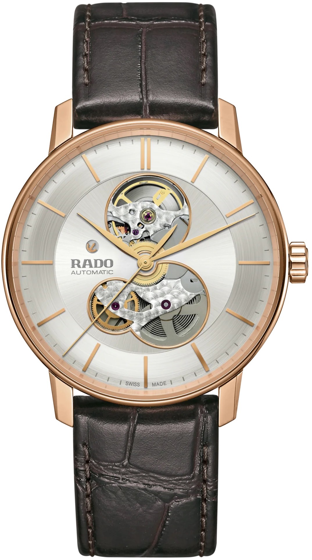 Rado Coupole Classic Automatic Open Heart R22895025 sú pánske elegantné automatické hodinky na hnedom koženom remienku s preklápacou sponou. Puzdro s PVD úpravou vo farbe ružového zlata má priemer 41 milimetrov. Strieborný číselník s efektom slnečného brusu je chránený zafírovým sklíčkom s obojstrannou antireflexnou vrstvou a spolu s priehľadným viečkom ponúka pohľad na mechanický strojček dekorovaný ženevskými pruhmi a perlážou. Tento mechanický strojček R734 (03.734.431) s automatickým náťahom a rezervou chodu 80 hodín disponuje funkciou hackingu (zastavenie sekundovej ručičky pri vytiahnutí korunky do krajnej polohy) a je možné ho v prípade potreby naťahovať aj ručne. Vďaka použitiu antimagnetického vlásku zotrvačky Nivachron™ z titánovej zliatiny je vysoko odolný voči vplyvom magnetického poľa. Na dosiahnutie čo najvyššej možnej presnosti je stroj testovaný v piatich pozíciách. S vodotesnosťou 5 ATM sú hodinky odolné proti dažďu a pri sprchovaní.