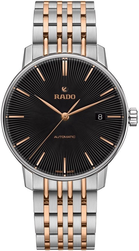 Rado Coupole Classic Automatic R22860163 sú pánske automatické hodinky v klasickom štýle na oceľovom bicolor náramku s motýľovou sponou a priemerom puzdra 37,7 milimetra. Luneta, korunka a časti náramku sú opatrené PVD úpravou vo farbe ružového zlata. Čierny fazetovaný číselník s dátumovkou na tretej hodine je chránený zafírovým sklíčkom s obojstrannou antireflexnou vrstvou. Priehľadné viečko umožňuje pohľad na mechanický strojček dekorovaný ženevskými pruhmi. Tento mechanický strojček R763 (03.763.438) s automatickým náťahom a rezervou chodu 80 hodín disponuje funkciou hackingu (zastavenie sekundovej ručičky pri vytiahnutí korunky do krajnej polohy). Vďaka použitiu antimagnetického vlásku zotrvačky Nivachron™ z titánovej zliatiny je vysoko odolný voči vplyvom magnetického poľa. Na dosiahnutie čo najvyššej možnej presnosti je stroj testovaný v piatich pozíciách. S vodotesnosťou 5 ATM sú hodinky odolné proti dažďu a pri sprchovaní.