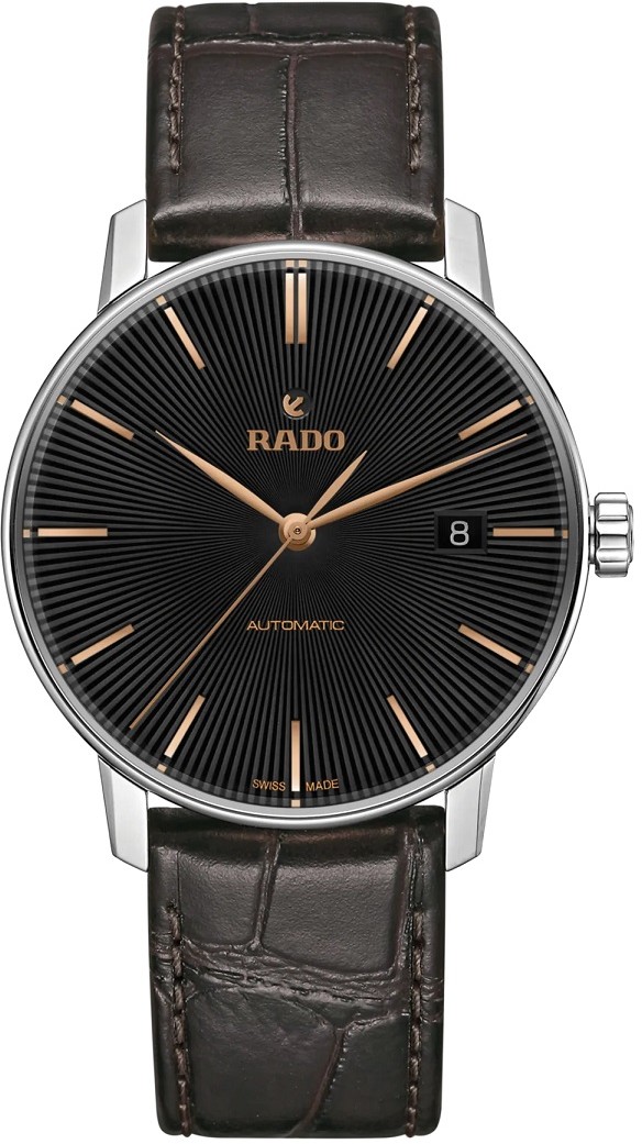 Rado Coupole Classic Automatic R22860165 sú pánske elegantné automatické hodinky na hnedom koženom pásiku s priemerom puzdra 37,7 milimetra. Čierny fazetovaný číselník s dátumovkou na tretej hodine je chránený zafírovým sklíčkom s obojstrannou antireflexnou vrstvou. Priehľadné viečko umožňuje pohľad na mechanický strojček dekorovaný ženevskými pruhmi. Tento mechanický strojček R763 (03.763.438) s automatickým náťahom a rezervou chodu 80 hodín disponuje funkciou hackingu (zastavenie sekundovej ručičky pri vytiahnutí korunky do krajnej polohy). Vďaka použitiu antimagnetického vlásku zotrvačky Nivachron™ z titánovej zliatiny je vysoko odolný voči vplyvom magnetického poľa. Na dosiahnutie čo najvyššej možnej presnosti je stroj testovaný v piatich pozíciách. S vodotesnosťou 5 ATM sú hodinky odolné proti dažďu a pri sprchovaní.