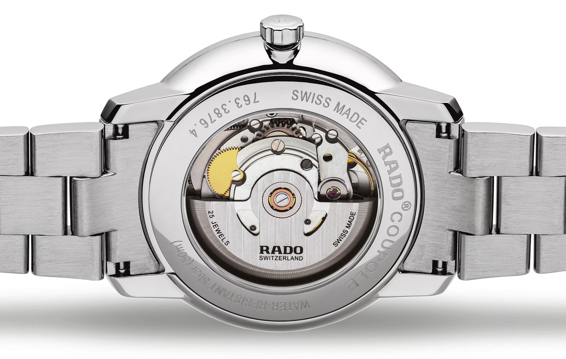 Rado Coupole Classic Automatic R22876013 sú pánske automatické hodinky v klasickom štýle na oceľovom náramku s motýlikovou sponou a priemerom puzdra 41 milimetrov. Biely číselník zdobený gilošou s modrými ručičkami a dátumovkou na tretej hodine je chránený zafírovým sklíčkom s obojstrannou antireflexnou vrstvou. Priehľadné viečko umožňuje pohľad na mechanický strojček dekorovaný ženevskými pruhmi. Tento mechanický strojček R763 (03.763.532) s automatickým náťahom a rezervou chodu 80 hodín disponuje funkciou hackingu (zastavenie sekundovej ručičky pri vytiahnutí korunky do krajnej polohy) a je možné ho v prípade potreby naťahovať aj ručne. Vďaka použitiu antimagnetického vlásku zotrvačky Nivachron™ z titánovej zliatiny je vysoko odolný voči vplyvom magnetického poľa. Na dosiahnutie čo najvyššej možnej presnosti je stroj testovaný v piatich pozíciách. S vodotesnosťou 5 ATM sú hodinky odolné proti dažďu a pri sprchovaní.