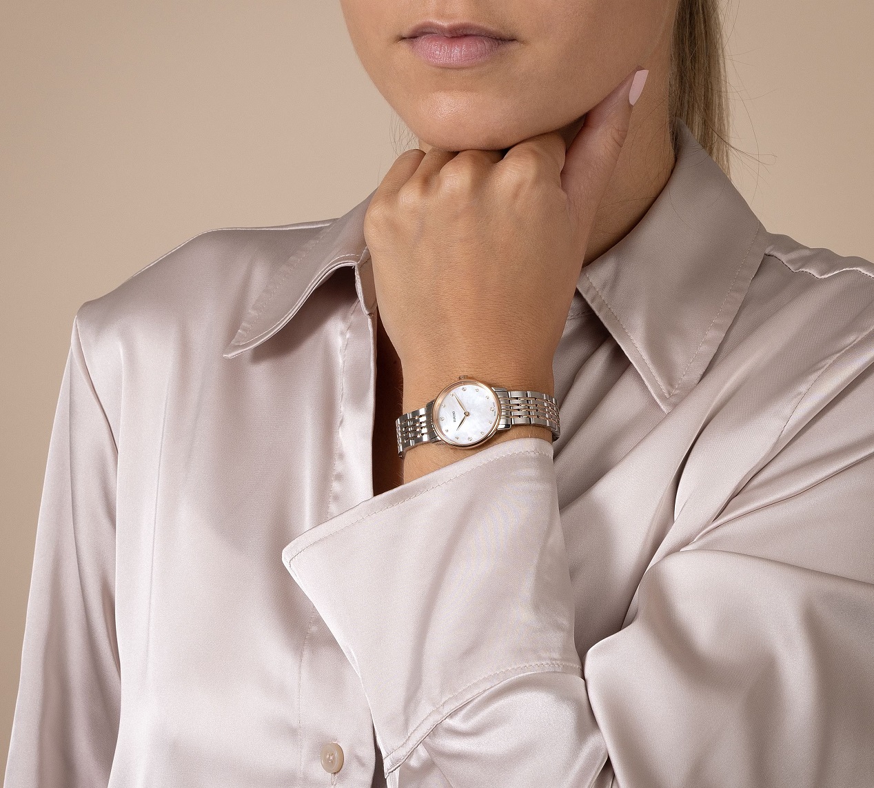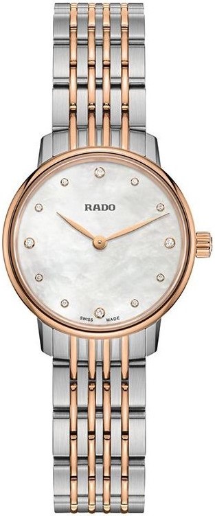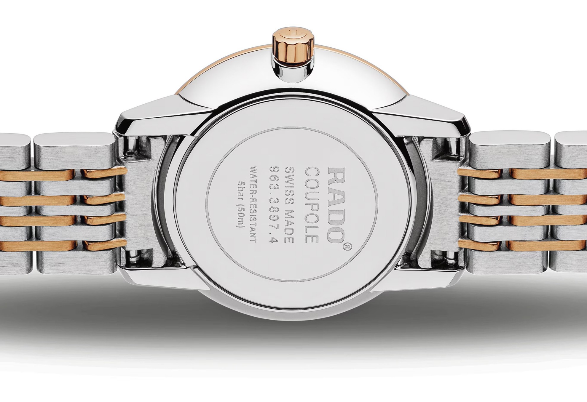 Rado Coupole R22897923 sú dámske batériové hodinky v klasickom štýle na oceľovom bicolor náramku s motýlikovou sponou a priemerom puzdra 27 milimetrov. Luneta, korunka a časti náramku sú opatrené PVD úpravou vo farbe ružového zlata. Číselník zdobený 12 diamantmi je z prírodnej perlete, každý jednotlivý kus je tak unikátny a jeho krása vyniká najmä pod priamym svetlom, kedy môžeme pozorovať hru farieb perlete. Číselník chráni zafírové sklo s obojstrannou antireflexnou vrstvou pre čo najlepšiu možnú čitateľnosť. Pohon hodiniek zaisťuje švajčiarsky quartzový strojček a s vodotesnosťou 5 ATM sú hodinky odolné proti dažďu a pri sprchovaní.