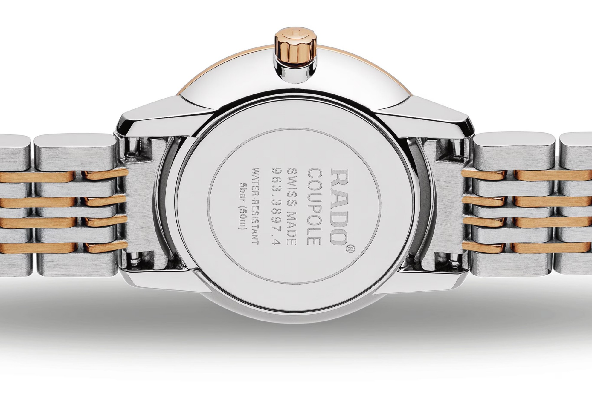 Rado Coupole R22897933 sú dámske batériové hodinky v klasickom štýle na oceľovom bicolor náramku s motýlikovou sponou a priemerom puzdra 27 milimetrov. Luneta, korunka a časti náramku sú opatrené PVD úpravou vo farbe ružového zlata. Číselník s rímskymi číslicami je z prírodnej perlete, každý jednotlivý kus je tak unikátny a jeho krása vyniká najmä pod priamym svetlom, kedy môžeme pozorovať hru farieb perlete. Číselník chráni zafírové sklo s obojstrannou antireflexnou vrstvou pre čo najlepšiu možnú čitateľnosť. Pohon hodiniek zaisťuje švajčiarsky quartzový strojček a s vodotesnosťou 5 ATM sú hodinky odolné proti dažďu a pri sprchovaní.