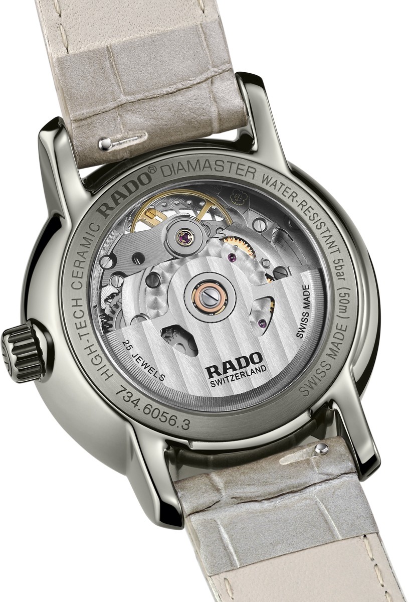 Rado DiaMaster Automatic Open Heart Diamonds R14056935 sú dámske automatické hodinky v elegantnom štýle so svetlo šedým koženým remienkom a priemerom puzdra 35 milimetrov. Puzdro je zo špeciálneho materiálu Plasma High-Tech Ceramic, ktorý je veľmi odolný proti poškriabaniu. Bielemu gilošovanému číselníku dominuje priehľad na strojček obklopený diamantmi, doplnený perleťovým terčom na siedmej hodine. Číselník je chránený zafírovým sklom s obojstrannou antireflexnou vrstvou pre čo najlepšiu možnú čitateľnosť. Priehľadné viečko umožňuje pohľad na stroj dekorovaný perlážou a ženevskými pruhmi. Tento mechanický strojček R734 (03.734.431) s automatickým náťahom a rezervou chodu 80 hodín disponuje funkciou hackingu (zastavenie sekundovej ručičky pri vytiahnutí korunky do krajnej polohy) a je možné ho v prípade potreby naťahovať aj ručne. Vďaka použitiu antimagnetického vlásku zotrvačky Nivachron™ z titánovej zliatiny je tento kaliber vysoko odolný voči vplyvom magnetického poľa. Pre dosiahnutie čo najvyššej možnej presnosti je stroj testovaný v piatich pozíciách. Vodotesnosť hodiniek je 5 ATM a sú teda odolné proti dažďu a pri sprchovaní.