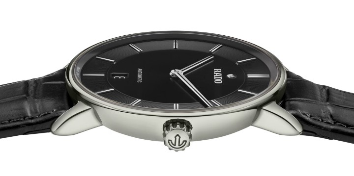 Rado DiaMaster Thinline Automatic R14067166 sú pánske automatické hodinky v elegantnom štýle s čiernym koženým remienkom a priemerom puzdra 40,3 milimetra. Puzdro je zo špeciálneho kompozitného materiálu Ceramos™, ktorý je veľmi odolný proti poškriabaniu. Čierny číselník s dátumovkou zdobia sústredné kruhy po jeho obvode a je chránený zafírovým sklom s obojstrannou antireflexnou vrstvou pre čo najlepšiu možnú čitateľnosť. Priehľadné viečko umožňuje pohľad na stroj dekorovaný perlážou a ženevskými pruhmi. Tento mechanický strojček R766 (03.766.111) s automatickým náťahom a rezervou chodu 72 hodín disponuje funkciou hackingu (zastavenie sekundovej ručičky pri vytiahnutí korunky do krajnej polohy) a je možné ho v prípade potreby naťahovať aj ručne. Vďaka použitiu antimagnetického vlásku zotrvačky Nivachron™ z titánovej zliatiny je tento kaliber vysoko odolný voči vplyvom magnetického poľa. Na dosiahnutie čo najvyššej možnej presnosti je stroj testovaný v piatich pozíciách. Vodotesnosť hodiniek robí 5 ATM a sú teda odolné proti dažďu a pri sprchovaní.