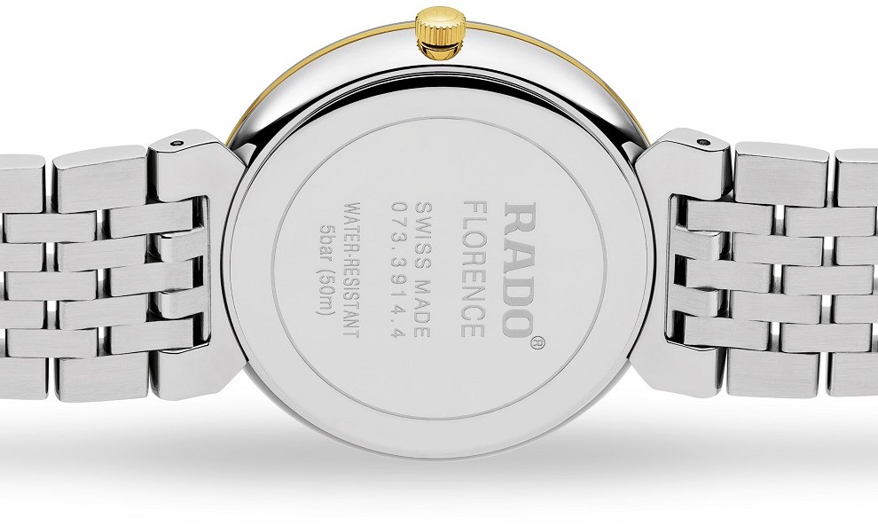 Rado Florence Classic R48912023 sú batériové unisex hodinky klasického štýlu s oceľovým puzdrom s priemerom 38 milimetrov a oceľovým náramkom s motýlikovou sponou. Časti náramku a puzdra sú opatrené povrchovou PVD úpravou vo farbe žltého zlata. Biely číselník v jednoduchom dizajne s dátumovkou na šiestej hodine je chránený tzv. „edge to edge“ zafírovým sklom s metalizovaným rámčekom, ktoré siaha až k úplnému okraju puzdra. Pohon hodiniek zaisťuje švajčiarsky quartzový strojček. S vodotesnosťou 5 ATM sú hodinky odolné proti dažďu a pri sprchovaní.