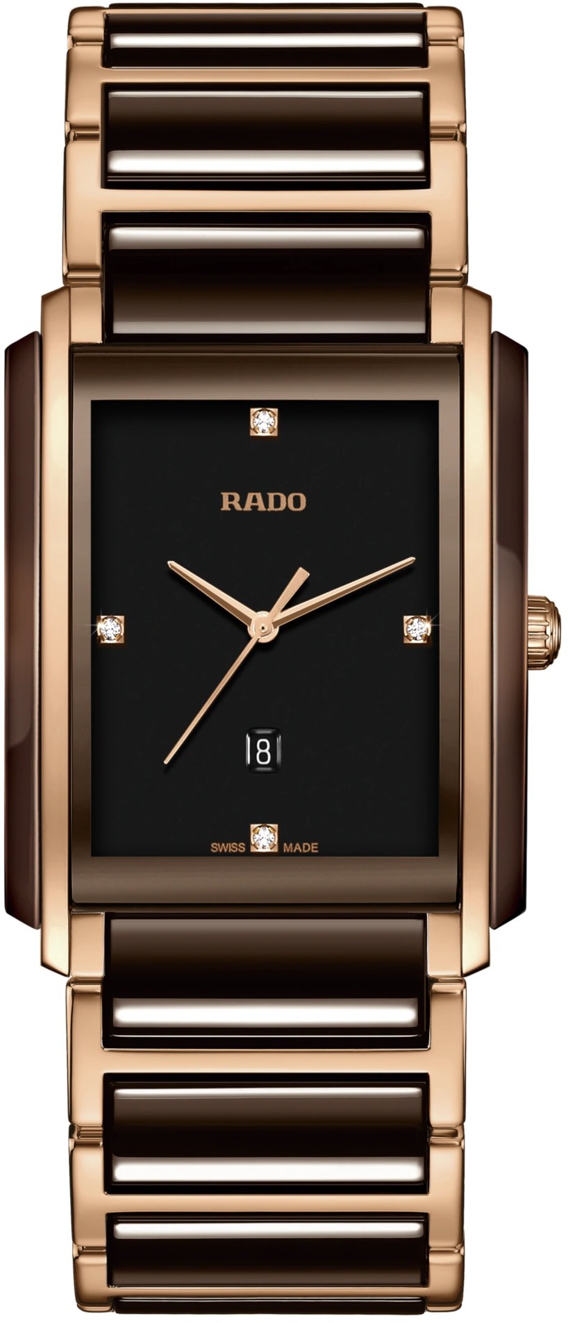 Rado Integral R20219712 sú elegantné unisex hodinky s hranatým puzdrom širokým 31 milimetrov. Materiál puzdra aj náramku tvorí kombinácia vysoko odolného materiálu High-Tech Ceramic s leštenou nerezovou oceľou opatrenou PVD úpravou vo farbe ružového zlata. Tmavo hnedý číselník s ukazovateľom dátumu a 4 diamantmi je chránený zafírovým sklíčkom. Pohon hodiniek zaisťuje švajčiarsky quartzový strojček. S vodotesnosťou 5 ATM sú hodinky odolné proti dažďu a pri sprchovaní.
