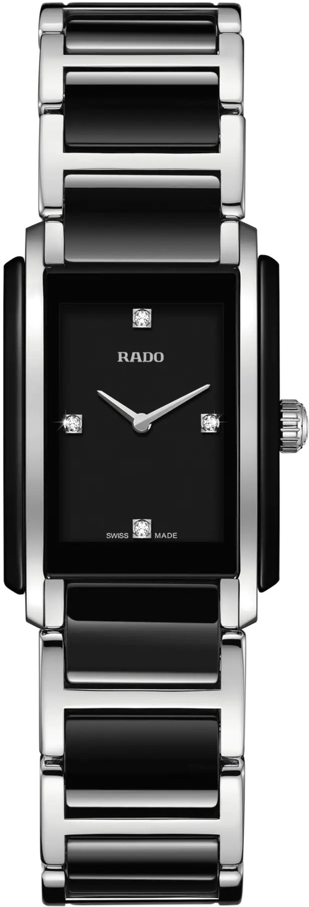 Rado Integral R20613712 sú elegantné dámske hodinky s hranatým puzdrom širokým 22,7 milimetra. Materiál puzdra aj náramku tvorí kombinácia vysoko odolného materiálu High-Tech Ceramic s leštenou nerezovou oceľou. Čierny číselník zdobený 4 diamantmi je chránený zafírovým sklíčkom. Pohon hodiniek zaisťuje švajčiarsky quartzový strojček. S vodotesnosťou 5 ATM sú hodinky odolné proti dažďu a pri sprchovaní.