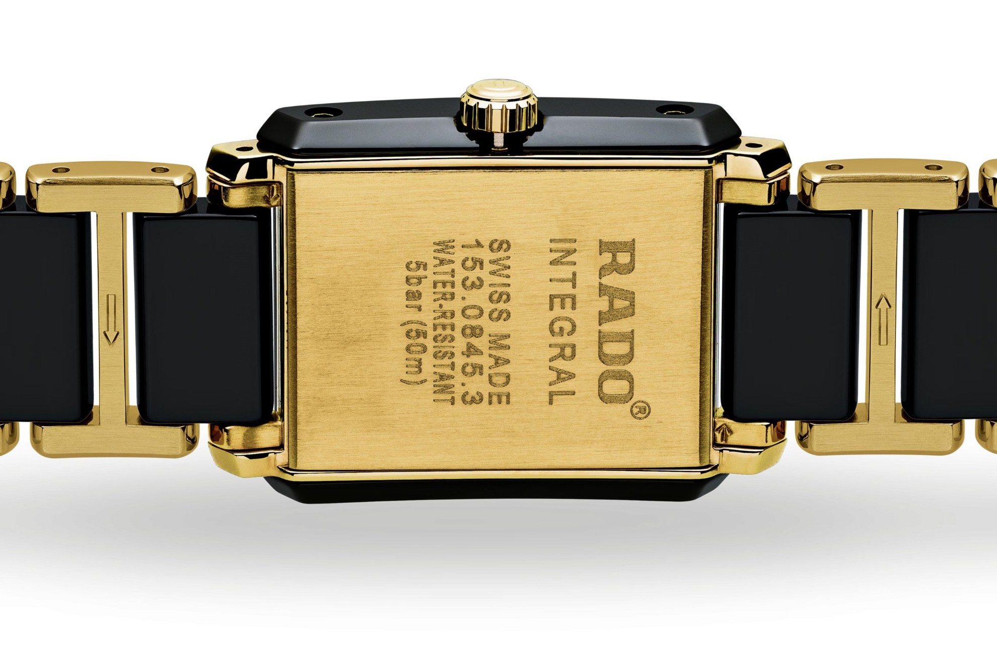 Rado Integral R20845712 sú elegantné dámske hodinky s hranatým puzdrom širokým 22,7 milimetra. Materiál puzdra aj náramku tvorí kombinácia vysoko odolného materiálu High-Tech Ceramic s leštenou nerezovou oceľou opatrenou PVD úpravou v zlatej farbe. Čierny číselník zdobený 4 diamantmi je chránený zafírovým sklíčkom. Pohon hodiniek zaisťuje švajčiarsky quartzový strojček. S vodotesnosťou 5 ATM sú hodinky odolné proti dažďu a pri sprchovaní.