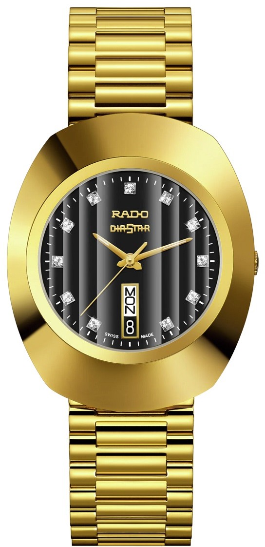 Rado Original R12304313 sú pánske klasické batériové hodinky s náramkom z nerezovej ocele a hardmetalovým puzdrom s priemerom 35,1 milimetra. Puzdro je pozlátené CVD metódou, zatiaľ čo náramok metódou PVD. Čierny číselník s ukazovateľom dátumu a dňa v týždni, zdobený 11 diamantmi, je chránený zafírovým sklíčkom. Ručičky sú potiahnuté náterom Super-LumiNova® pre čo najlepšiu čitateľnosť za zhoršených svetelných podmienok. Pohon hodiniek zaisťuje švajčiarsky quartzový strojček. S vodotesnosťou 3 ATM sú hodinky odolné proti vlhkosti a dažďu.