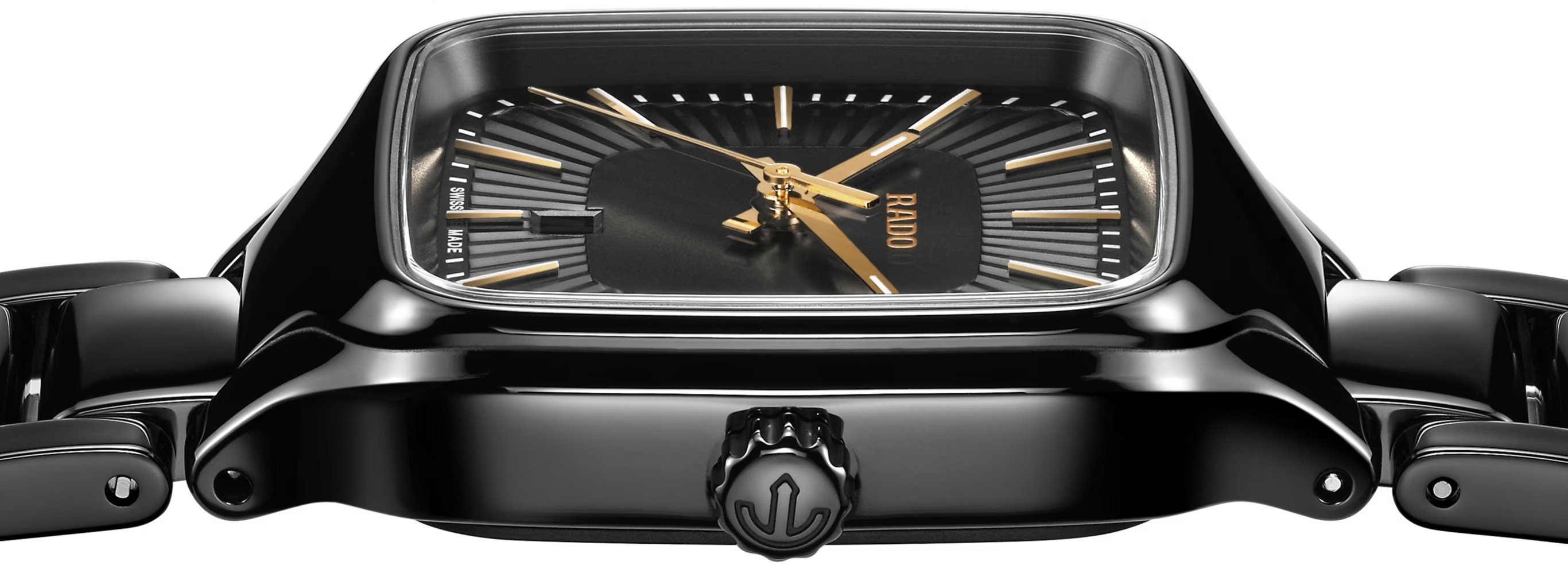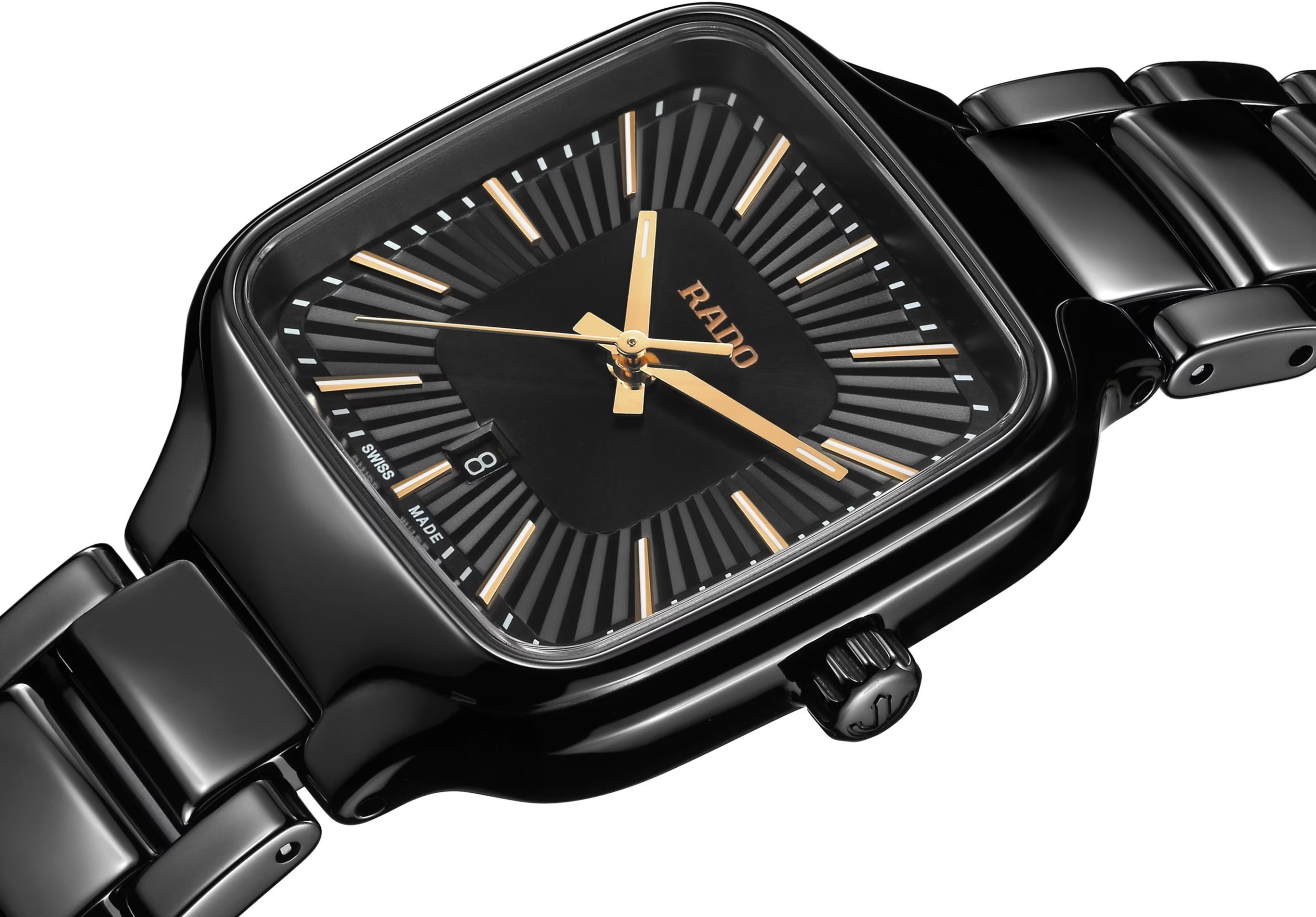 Rado True Square R27080172 sú dámske elegantné hodinky vyrobené zo špeciálneho materiálu High-Tech Ceramic. Vďaka tomuto materiálu sú hodinky ľahké, hypoalergénne a odolné voči poškriabaniu. Hranaté puzdro hodiniek je široké 29,2 milimetra. Čierny číselník s radiálnou plisovanou štruktúrou a ukazovateľom dátumu na šiestej hodine je chránený zafírovým sklom. Ručičky a indexy vo farbe ružového zlata sú pre lepšiu čitateľnosť za zhoršených svetelných podmienok potiahnuté luminiscenčnou vrstvou Super-LumiNova®. Pohon hodiniek zaisťuje švajčiarsky quartzový strojček R079. Hodinky disponujú vodotesnosťou 5 ATM a sú teda odolné proti dažďu a pri sprchovaní.