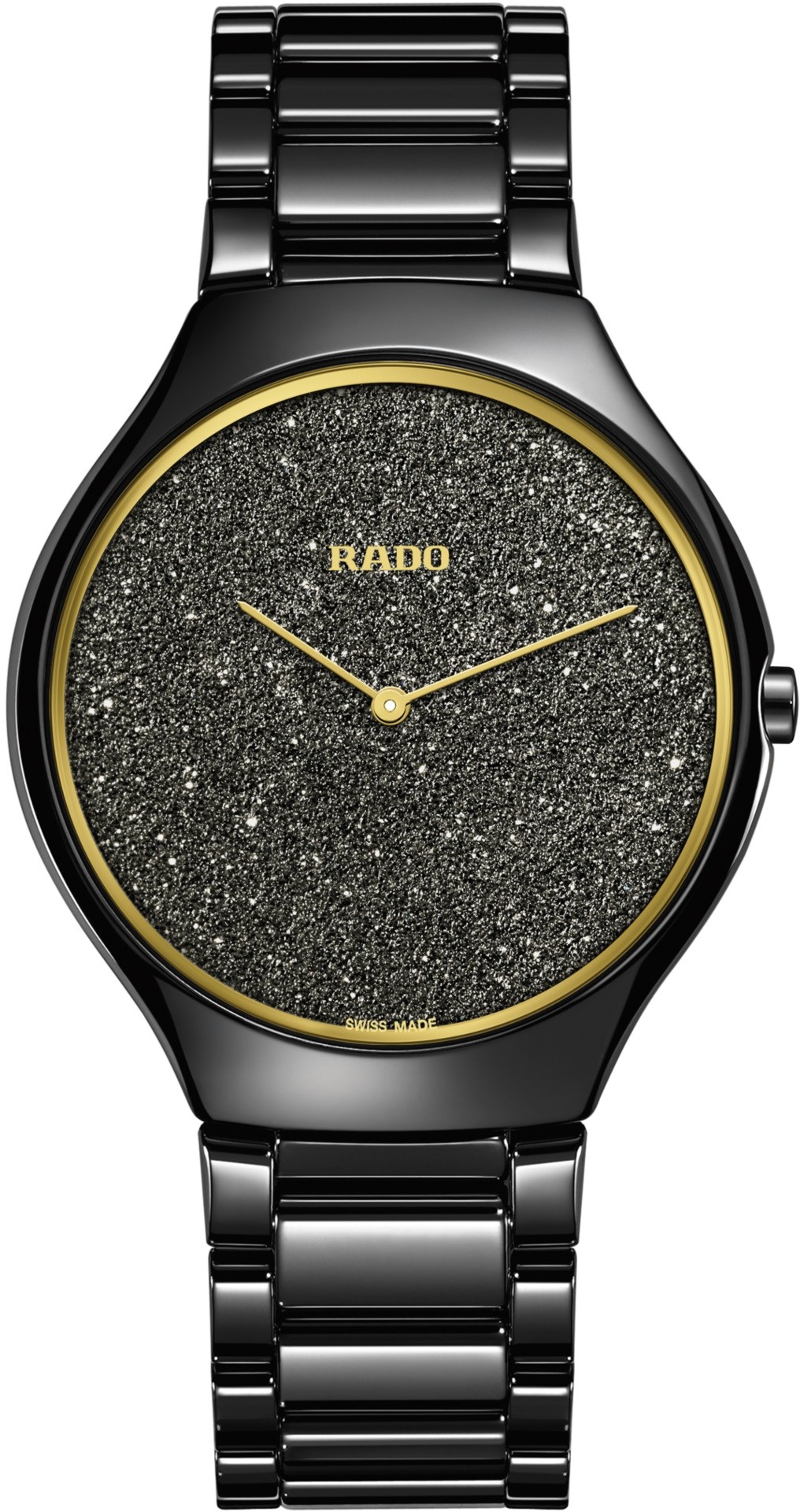Rado True Thinline R27009152 sú dámske elegantné hodinky vyrobené zo špeciálneho materiálu High-Tech Ceramic v čiernej farbe. Vďaka tomuto materiálu sú hodinky ľahké, hypoalergénne a odolné voči poškriabaniu. Ultratenké puzdro hodiniek má priemer 39 milimetrov a hrúbku iba 5 milimetrov. Trblietavý čierny číselník s ručičkami a vnútornou lunetou vo farbe zlata je chránený odolným zafírovým sklom s obojstrannou antireflexnou vrstvou. Pohon hodiniek zaisťuje švajčiarsky quartzový strojček R420. Hodinky disponujú vodotesnosťou 3 ATM a sú teda odolné proti vlhkosti, dažďu a pri umývaní rúk.