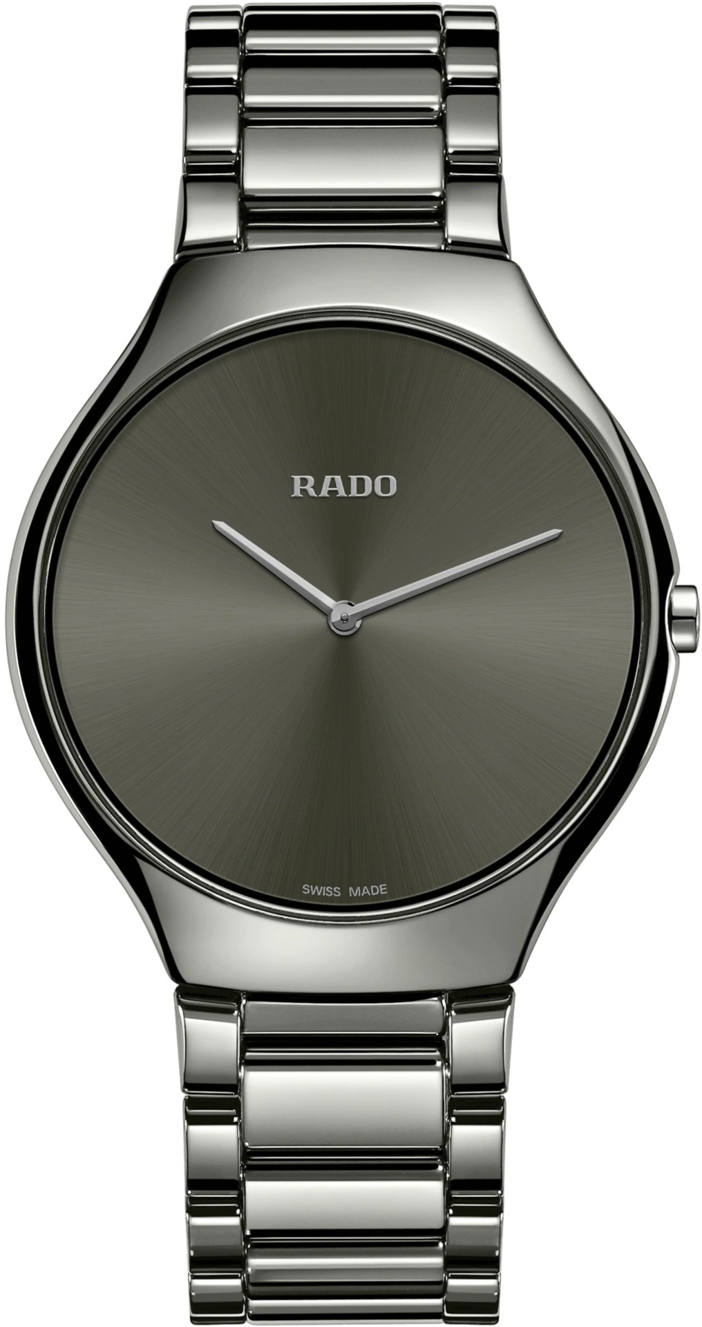 Rado True Thinline R27955122 sú elegantné unisex hodinky vyrobené zo špeciálneho materiálu Plasma High-Tech Ceramic. Vďaka tomuto materiálu sú hodinky ľahké, hypoalergénne a odolné voči poškriabaniu. Ultratenké puzdro hodiniek má priemer 39 milimetrov a hrúbku iba 5 milimetrov. Antracitový číselník s efektom slnečného brusu je chránený odolným zafírovým sklom. Pohon hodiniek zaisťuje švajčiarsky quartzový strojček. Hodinky disponujú vodotesnosťou 3 ATM a sú teda odolné proti vlhkosti, dažďu a pri umývaní rúk.