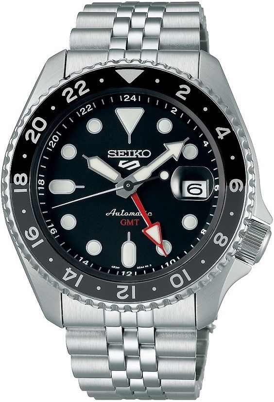 Pánske automatické hodinky Seiko 5 Sports 'Black Grape' GMT SSK001K1 na kovovom náramku v štýle jubilee s preklápacou sponou. Puzdro z nerezovej ocele vychádzajúce z kultového modelu SKX007 má priemer 42,5 milimetra a priehľadné zadné viečko. Čierny číselník s indikáciou dátumu a funkciou GMT chráni odolné sklo Hardlex so zväčšujúcou lupou nad ukazovateľom dátumu. Aplikované hodinové indexy sú rovnaké ako ručičky pokryté luminiscenčným náterom LumiBrite, ktorý garantuje perfektnú čitateľnosť za zhoršených svetelných podmienok. GMT ručička je vyhotovená v kontrastnej červenej farbe. Hodinky sú vybavené obojsmerne otočnou GMT lunetou s Hardlexovou vložkou. Pohon hodiniek zaisťuje mechanický strojček 4R34 s automatickým náťahom a rezervou chodu približne 41 hodín. Tento manufaktúrny strojček s funkciou hackingu možno v prípade potreby naťahovať aj ručne pomocou korunky. Vodotesnosť hodiniek je 10 ATM a sú vhodné na kúpanie alebo šnorchlovanie.