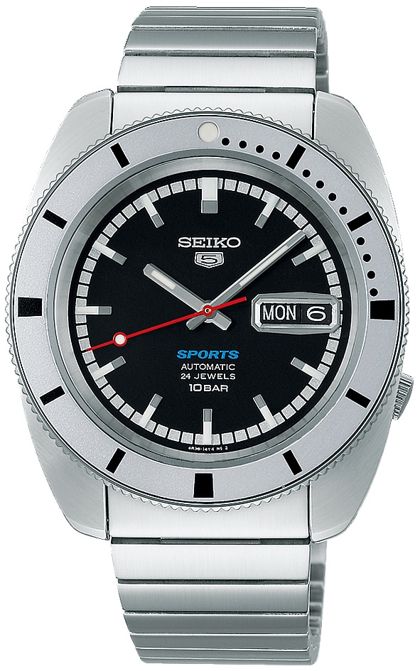 V kolekcii Seiko 5 Sports sa znovu objavuje obľúbený dizajn hodiniek Seiko, ktorý bol populárny po celom svete na prelome 60. a 70. rokov. Znovu uvedený dizajn, ktorého veľkosť a tvar sa čo najviac blíži k originálu, je poháňaný osvedčeným a spoľahlivým automatickým strojčekom 4R36 s rezervou chodu 41 hodín. Táto limitovaná edícia v počte 9999 kusov pre celý svet predstavuje dokonalú rovnováhu medzi nostalgickým dizajnom originálu a dnešnou modernou hodinárskou technológiou. Číselník v čiernej farbe má pôvodné logo Seiko 5 umiestené na pozícii 12 hodín a na 6. hodine sa objavuje modrý nápis "SPORTS". Samozrejmosťou je ukazovateľ dňa a dátumu na 3. hodine. Ručičky a indexy pokryté vrstvou Lumibrite zaisťujú vynikajúcu čitateľnosť v tme. Novo vytvorený náramok má vylepšenú a pevnú konštrukciu. Napriek tomu je jeho podobnosť s historickým originálom ľahko viditeľná a predstavuje ďalší dizajnový detail, ktorý pevne zakotvuje estetiku hodiniek na začiatku príbehu Seiko 5 Sports. Hodinky sú dodávané s náhradným športovým retro koženým remienkom v špeciálne navrhnutej krabičke, ktorá evokuje vintage atmosféru doby, kedy sa zrodili pôvodné hodinky Seiko 5 Sports.