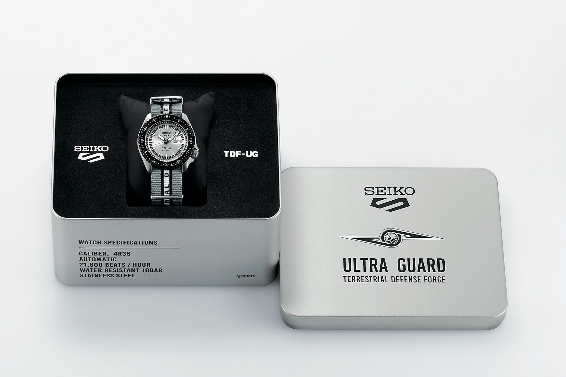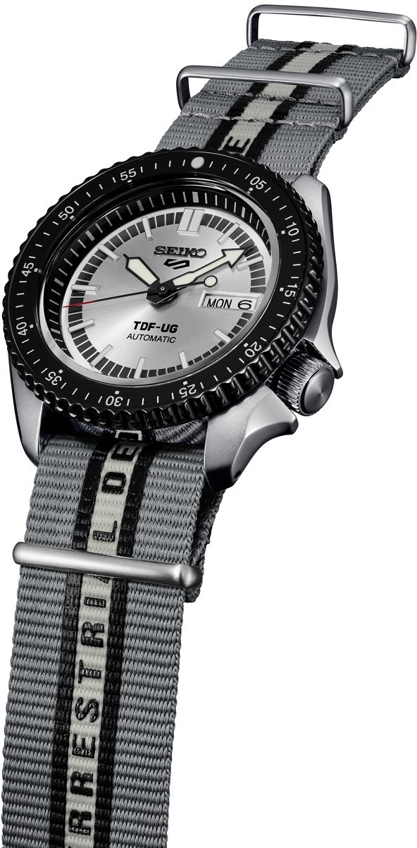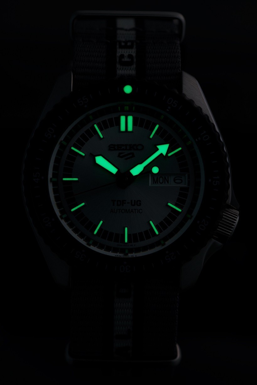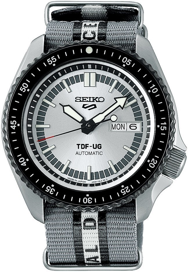 Seiko 5 Sports s potešením predstavuje model v spolupráci s Ultraseven, ktorý oslavuje 55. výročie vysielania tohto japonského sci-fi televízneho seriálu. Model vychádza z dizajnu, ktorý vzdáva hold prvým hodinkám Seiko 5 Sports a svojim sfarbením a dizajnom evokuje Ultra Guard – elitnú jednotku pozemských obranných síl. Nylonový remienok bol špeciálne navrhnutý tak, aby pripomínal uniformu elitnej jednotky Ultra Guard a je navyše opatrený nápisom „Terrestrial Defense Force“. Strieborný číselník s indikáciou dňa a dátumu je krytý odolným sklom Hardlex. Aplikované hodinové indexy sú rovnako ako ručičky pokryté luminiscenčným náterom LumiBrite, ktorý garantuje perfektnú čitateľnosť za zhoršených svetelných podmienok. Hodinky sú vybavené jednosmerne otočnou lunetou s hliníkovou vložkou s minútovou stupnicou. Pohon hodiniek zaisťuje mechanický strojček 4R36 s automatickým náťahom a rezervou chodu približne 41 hodín. Tento manufaktúrny strojček s funkciou hackingu možno v prípade potreby naťahovať aj ručne pomocou korunky. Vodotesnosť hodiniek je 10 ATM a sú vhodné na kúpanie alebo šnorchlovanie.