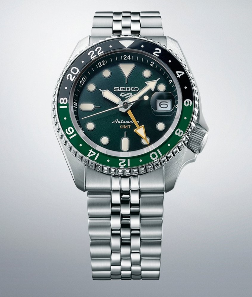 Pánske automatické hodinky Seiko 5 Sports SKX Series SSK035K1 na oceľovom náramku v štýle jubilee s preklápacou sponou. Puzdro z nerezovej ocele v kombinácii matovania a lesku vychádzajúce z kultového modelu SKX007 má priemer 42,5 milimetra, priehľadné zadné viečko a obojsmerne otočnú GMT lunetu s Hardlexovou vložkou. Zelený číselník s efektom slnečného brusu, indikáciou dátumu a funkciou GMT chráni odolné sklo Hardlex s lupou nad dátumovkou. Aplikované hodinové indexy sú rovnako ako ručičky pokryté luminiscenčným náterom LumiBrite, ktorý garantuje perfektnú čitateľnosť za zhoršených svetelných podmienok. GMT rúčka v žltej farbe kontrastuje so zeleným číselníkom. Pohon hodiniek zaisťuje mechanický strojček 4R34 s automatickým náťahom a rezervou chodu približne 41 hodín. Tento manufaktúrny strojček s funkciou hackingu je možné v prípade potreby naťahovať aj ručne pomocou korunky. Vodotesnosť hodiniek je 10 ATM a sú teda vhodné na kúpanie alebo šnorchlovanie.