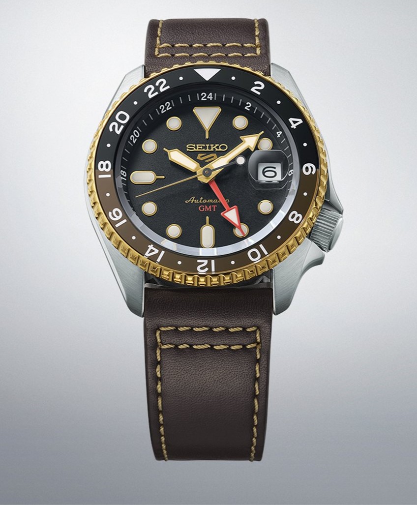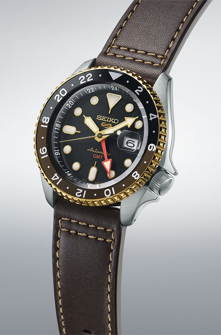 Pánske automatické hodinky Seiko 5 Sports SKX Series SSK036K1 na hnedom koženom remienku s béžovým prešívaním a tŕňovou sponou. Puzdro z nerezovej ocele v kombinácii matovania a lesku vychádzajúce z kultového modelu SKX007 má priemer 42,5 milimetra, priehľadné zadné dýnko a obojsmerne otočnú GMT lunetu s PVD úpravou zlatej farby a čiernou Hardlexovou vložkou. Čierny číselník s indikáciou dátumu a funkciou GMT chráni odolné sklo Hardlex s lupou nad dátumovkou. Aplikované hodinové indexy sú rovnako ako rúčky pokryté luminiscenčným náterom LumiBrite, ktorý garantuje perfektnú čitateľnosť za zhoršených svetelných podmienok. GMT rúčka v oranžovej farbe kontrastuje s čiernym číselníkom. Pohon hodiniek zaisťuje mechanický strojček 4R34 s automatickým náťahom a rezervou chodu približne 41 hodín. Tento manufaktúrny strojček s funkciou hackingu je možné v prípade potreby naťahovať aj ručne pomocou korunky. Vodotesnosť hodiniek je 10 ATM a sú teda vhodné na kúpanie alebo šnorchlovanie.