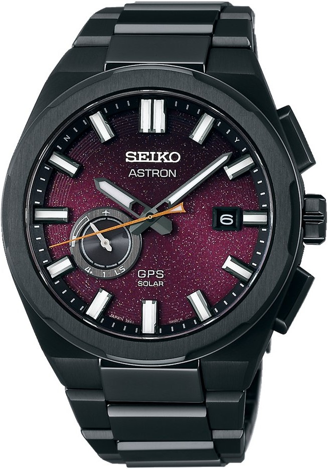 Seiko Astron GPS Solar 2025 Limited Edition Yozakura Cherry Blossom By Night SSJ029J1 sú pánske športové hodinky na titánovom integrovanom náramku s čiernou povrchovou DLC úpravou a preklápacou sponou s mikroreguláciou. Puzdro z titánu v rovnakej farbe má priemer 42 milimetrov. Línia puzdra plynule prechádzajú cez nožičky do integrovaného náramku, ktorý má ostrý dizajn ladiaci s hranatým puzdrom a dodáva hodinkám rafinovaný vzhľad. Tento náramok sa smerom na zapínanie zužuje. Titánové puzdro aj náramok majú povrchovú úpravu, tzv. super-hard coating, odolnú proti poškriabaniu a vďaka nízkej hmotnosti titánu a nízkemu ťažisku puzdra hodinky pohodlne sedia na zápästí. Fialový číselník s indikáciou dátumu, večným kalendárom a so subciferníkom je inšpirovaný čerešňovými kvetmi v noci a chránený zafírovým sklom. Subciferník plní úlohu indikácie procesu príjmu signálu GPS, stavu nabitia batérie, príjmu prestupných sekundových dát a letového režimu. Aplikované hodinové indexy sú rovnako ako ručičky pokryté luminiscenčným náterom LumiBrite, ktorý garantuje perfektnú čitateľnosť za zhoršených svetelných podmienok. Pohon hodiniek zaisťuje solárny batériový strojček 3X62 s prevenciou prebíjania a funkciou úspory energie. Hodinky prijímajú signál GPS pre automatické nastavenie času a nastavenie časového pásma. Strojček má presnosť cca 15 sekúnd za mesiac bez príjmu signálu GPS a pri teplotách 5 - 35 ° C a disponuje rezervou chodu zhruba 6 mesiacov pri plnom nabití. Vodotesnosť hodiniek činí 10 ATM a sú teda vhodné na kúpanie alebo šnorchlovanie. Ide o limitovanú edíciu v počte 1500 kusov pre celý svet.