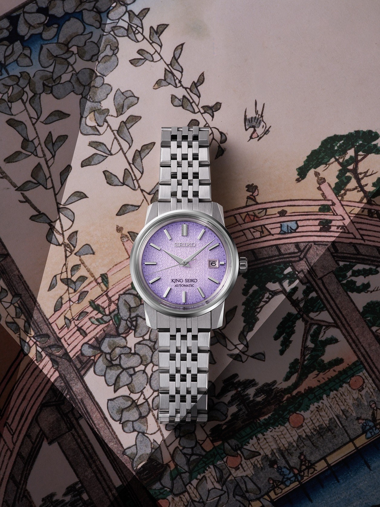 Pánske automatické hodinky Seiko King Seiko KSK 6L 'Tenjin-Fuji Violet' SJE107J1 na oceľovom sedemradovom náramku s motýlikovou sponou. Puzdro z nerezovej ocele s ostro rezanými hranami vychádzajúce zo známych King Seiko KSK z roku 1965 má priemer 38,6 milimetra a dýnko značené pôvodným logom King Seiko. Gradientný svetlo fialový texturovaný číselník so vzorom kvetu vistárie a indikáciou dátumu je chránený odolným vyklenutým zafírovým sklom s antireflexnou vrstvou. Dizajn číselníka upravený do podoby japonského umenia „Ukiyo-e“ je inšpirovaný svätyňou Kameido Tenjin, kde boli vistárie vysadené počas obdobia Edo. Kvety vistárie visiace z mreží v japonskej záhrade sú návštevníckou atrakciou počas apríla a mája. Počas festivalu Fuji sa vistárie v noci rozsvecujú a dodávajú oblasti fialovú žiaru. Fialový číselník dopĺňajú výrazné aplikované indexy, ktorým dominuje štruktúrovaný index na dvanástej hodine. Pohon hodiniek zaisťuje mechanický strojček 6L35 s automatickým náťahom a rezervou chodu približne 45 hodín. Tento manufaktúrny strojček s funkciou hackingu je možné v prípade potreby naťahovať aj ručne pomocou signovanej korunky. Vodotesnosť hodiniek je 5 ATM a sú teda odolné proti dažďu a pri sprchovaní.
