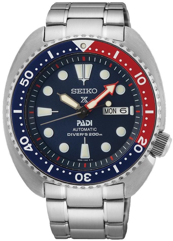 Pánske automatické hodinky Seiko Prospex Sea PADI Special Edition SRPE99K1 na kovovom náramku s preklápacou sponou a bezpečnostným zámkom, ktorý možno uvoľniť tlačidlom. Spona obsahuje predĺženie náramku, čo je praktické najmä v prípade potápania. Typicky tvarované puzdro v tvare korytnačieho panciera z nerezovej ocele s kombináciou matovania a lesku má priemer 45 milimetrov, zadné viečko označené „SPECIAL EDITION“ a jednosmerne otočnú „pepsi“ lunetu s hliníkovou vložkou s potápačskou stupnicou. Medzi fanúšikmi je tento tvar puzdra známy tiež pod pomenovaním „Korytnačky“. Modrý číselník s indikáciou dňa a dátumu je chránený odolným hardlexovým sklom. Nápis „PADI“ na číselníku odkazuje na spoluprácu medzi značkou Seiko a Profesionálnou asociáciou potápačských inštruktorov. Aplikované hodinové indexy sú ako ručičky a luneta pokryté luminiscenčným náterom LumiBrite, ktorý garantuje perfektnú čitateľnosť za zhoršených svetelných podmienok. Pohon hodiniek zaisťuje mechanický strojček 4R36 s automatickým náťahom a rezervou chodu približne 41 hodín. Tento manufaktúrny strojček s funkciou hackingu možno v prípade potreby naťahovať aj ručne pomocou skrutkovacej korunky. Vodotesnosť hodiniek je 20 ATM a s certifikáciou ISO 6425 sú vhodnou voľbou pre prístrojové potápanie.