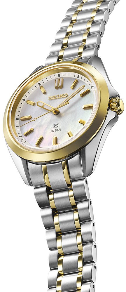 Dámske batériové hodinky Seiko Prospex Sea SUR608J1 na oceľovom náramku s preklápacou sponou. Dva rady náramku, luneta a korunka disponujú povrchovou PVD úpravou zlatej farby ladiacej s indexmi a ručičkami. Puzdro z nerezovej ocele má priemer 34 milimetrov. Tieto univerzálne hodinky v klasickom dizajne využijete na každodenné nosenie. Perleťový číselník je chránený odolným zafírovým sklom a jeho krása vyniká najmä na priamom svetle, kedy môžeme pozorovať hru farieb perlete. Aplikované hodinové indexy sú rovnako ako ručičky pokryté luminiscenčným náterom LumiBrite, ktorý garantuje perfektnú čitateľnosť za zhoršených svetelných podmienok. Pohon hodiniek zaisťuje spoľahlivý quartzový strojček 6N01 s presnosťou ±15 sekúnd za mesiac. S vodotesnosťou 20 ATM sú hodinky vhodné na hlbinné potápanie.