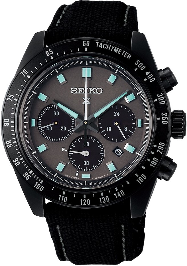 Pánske solárne hodinky Seiko Prospex Speedtimer The Black Series ‘Night Vision’ Solar Speedtimer Chronograph SSC923P1 na textilnom remienku s preklápacou sponou. Puzdro z nerezovej ocele s čiernou povrchovou PVD úpravou má priemer 41,4 milimetra a lunetu s funkciou tachymetra. Šedý číselník s čiernymi subciferníkmi s funkciou chronografu a indikáciou dátumu je chránený odolným zafírovým sklom s antireflexnou vrstvou. Aplikované hodinové indexy sú rovnako ako ručičky pokryté svetlo zeleným luminiscenčným náterom LumiBrite, ktorý garantuje perfektnú čitateľnosť za zhoršených svetelných podmienok. Pohon hodiniek zaisťuje solárny batériový strojček V192 s výdržou až 6 mesiacov pri plnom nabití. Vodotesnosť hodiniek je 10 ATM a sú vhodnou voľbou na kúpanie alebo šnorchlovanie.