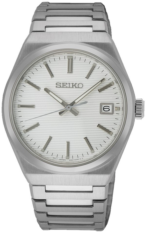 Pánske batériové hodinky Seiko Quartz SUR553P1 na kovovom náramku s preklápacou sponou. Puzdro z nerezovej ocele s kombináciou brusu a lesku má priemer 38,9 milimetra. Biely textúrovaný číselník s ľahkým retro nádychom disponuje indikáciou dátumu a je chránený odolným zafírovým sklom. Aplikované hodinové indexy sú doplnené ručičkami pokrytými luminiscenčným náterom LumiBrite, ktorý garantuje perfektnú čitateľnosť za zhoršených svetelných podmienok. Pohon hodiniek zaisťuje spoľahlivý quartzový strojček 6N52. Vodotesnosť hodiniek je 10 ATM a sú vhodné na kúpanie alebo šnorchlovanie.