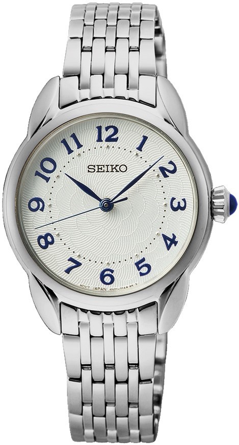 Dámske batériové hodinky Seiko SUR561P1 na kovovom náramku s preklápacou sponou vhodne doplní váš každodenný outfit. Puzdro z nerezovej ocele má priemer 28,7 milimetra a korunku osadenú modrým kabošonom, ktorý farebne ladí s arabskými číslicami a ručičkami. Biely číselník zdobený jemnou gilošou chráni odolné sklo Hardlex. Pohon hodiniek zaisťuje spoľahlivý quartzový strojček 6N01. Vodotesnosť hodiniek je 5 ATM a sú tak odolné proti dažďu a pri sprchovaní.