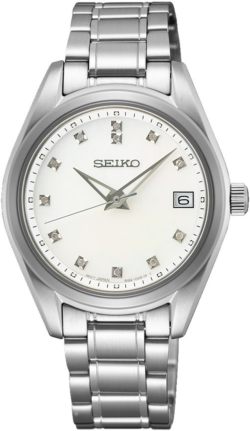 Dámske batériové hodinky Seiko Quartz SUR579P1 na oceľovom náramku s preklápacou sponou. Puzdro z nerezovej ocele má priemer 32 milimetrov. Tieto univerzálne hodinky v klasickom dizajne využijete na každodenné nosenie. Perleťový číselník s indikáciou dátumu na tretej hodine zdobený 12 diamantmi je chránený odolným zafírovým sklom. Ručičky sú pokryté luminiscenčným náterom LumiBrite, ktorý garantuje perfektnú čitateľnosť za zhoršených svetelných podmienok. Pohon hodiniek zaisťuje spoľahlivý quartzový strojček 6N32. S vodotesnosťou 10 ATM sú hodinky vhodné na kúpanie alebo šnorchlovanie.