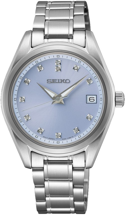 Dámske batériové hodinky Seiko Quartz SUR581P1 na oceľovom náramku s preklápacou sponou. Puzdro z nerezovej ocele má priemer 32 milimetrov. Tieto univerzálne hodinky v klasickom dizajne využijete na každodenné nosenie. Modrý číselník s efektom slnečného brusu, indikáciou dátumu a 12 diamantmi je chránený odolným zafírovým sklom. Ručičky sú pokryté luminiscenčným náterom LumiBrite, ktorý garantuje perfektnú čitateľnosť za zhoršených svetelných podmienok. Pohon hodiniek zaisťuje spoľahlivý quartzový strojček 6N32. S vodotesnosťou 10 ATM sú hodinky vhodné na kúpanie alebo šnorchlovanie.