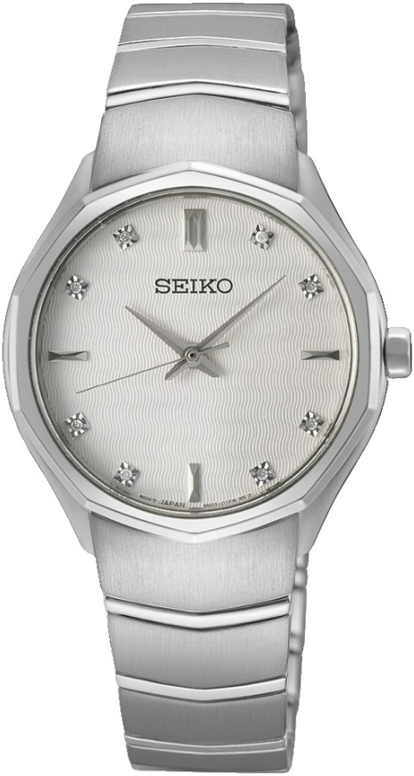 Dámske batériové hodinky Seiko Quartz SUR615P1 na oceľovom náramku v kombinácii brusu a lesku. Puzdro z nerezovej ocele má priemer 30 milimetrov. Biely číselník s jemnou textúrou vĺn a 8 diamantmi na pozíciách indexov je chránený odolným zafírovým sklom. Pohon hodiniek zaisťuje spoľahlivý quartzový strojček 6N01. Vodotesnosť hodiniek je 5 ATM a sú teda odolné proti dažďu a pri sprchovaní.
