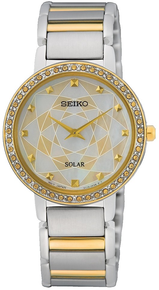 Dámske solárne hodinky Seiko Solar SUP454P1 na kovovom bicolor náramku s kombináciou matovania a lesku a preklápacou sponou. Puzdro z nerezovej ocele má priemer 30,5 milimetra a hrúbku 6,8 milimetra. S týmito kompaktnými rozmermi sú hodinky veľmi pohodlné pre väčšinu veľkostí zápästia. Vzorovaný číselník, ktorý farebne ladí s drobnými zirkónmi na lunete a korunkou, je chránený odolným sklom Hardlex. Celkový elegantný vzhľad hodiniek doplňujú decentné hodinové indexy a jednoduché ručičky. Pohon hodiniek zaisťuje solárny batériový strojček V115, nemusíte sa teda starať o výmenu batérie. Vodotesnosť hodiniek je 3 ATM a sú odolné proti vlhkosti a dažďu.