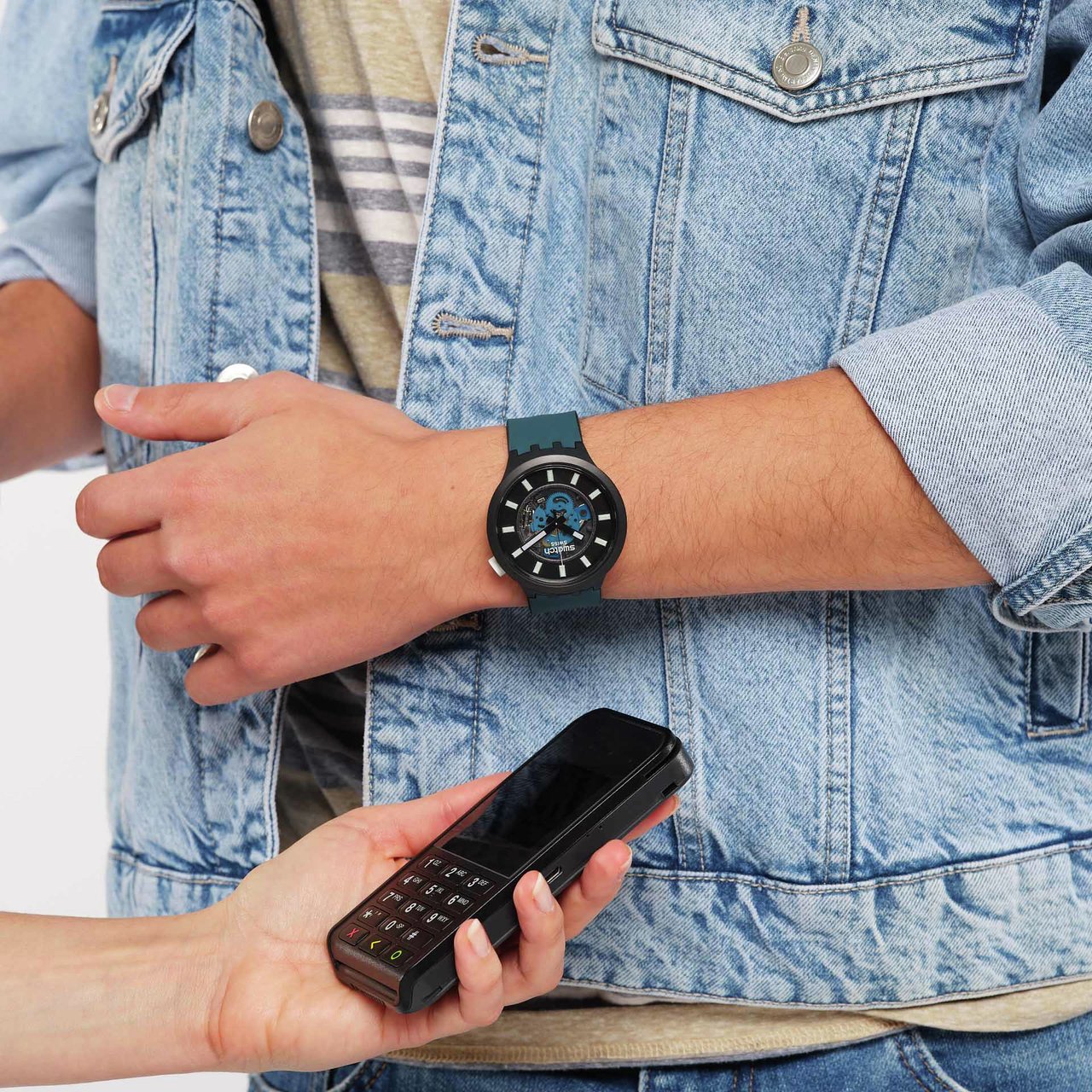 A ako to funguje? V každom modeli hodiniek SwatchPAY! je ukrytý NFC čip, ktorý funguje rovnakým spôsobom ako vaša bežná platobná karta, ktorá umožňuje bezkontaktné platby. Veľkou výhodou je, že NFC čip nijako neovplyvňuje výdrž batérie hodiniek. Stačí hodinky priblížiť k platobnému terminálu, ktorého čítačka si s NFC čipom vymení platobné informácie a máte hotovo. Stratili ste hodinky? Žiadnu paniku. Stačí jedným kliknutím deaktivovať platobnú funkciu hodiniek vo SwatchPAY! aplikáciu vo vašom telefóne či tablete. A rovnako ako všetky Swatch hodinky, sú aj modely SwatchPAY! vodeodolné do 30 metrov.