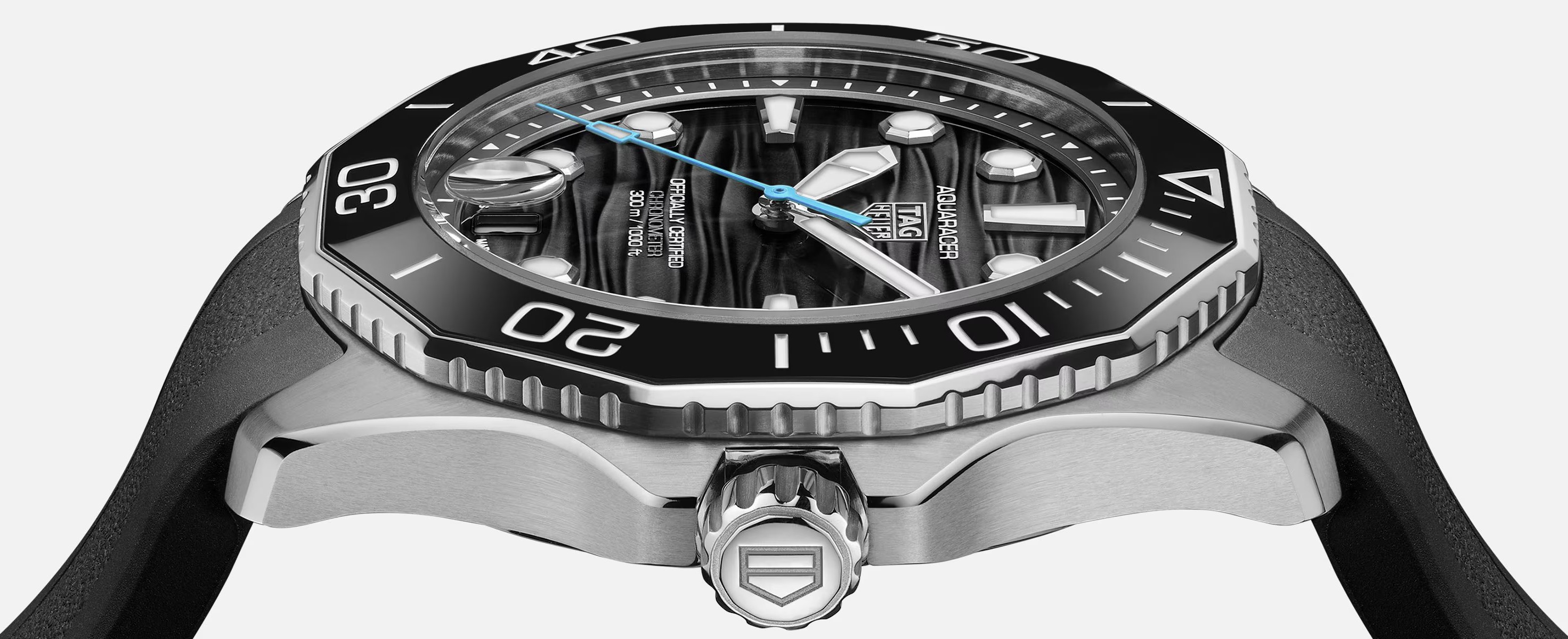 V ponuke značky TAG Heuer nemôžu chýbať potápačské modely. Tie nesú označenie Aquaracer a všetky majú charakteristický dizajn s dvanásťstrannou otočnou lunetou a výraznou korunkou s elegantnou ochranou. V rade Aquaracer nájdeme bohatú paletu modelov, vyberať je možné z mnohých prevedení číselníkov, použitých materiálov a spôsobov spracovania aj radu veľkostí. Modely Aquaracer Professional 200 majú vodotesnosť do 200 metrov a k dispozícii sú s puzdrami s priemerom 30, 34 a 40 milimetrov, sú teda vhodné aj pre užívateľov s menším zápästím. Na výber sú hodinky s quartzovým strojčekom so solárnym pohonom alebo mechanické s automatickým náťahom. Modely Aquaracer Professional 300 sú k dispozícii s oceľovými alebo titánovými puzdrami s priemerom 36, 42 alebo 43 milimetrov. Ako názov napovedá hodinky disponujú vodotesnosťou 300 metrov. Na špičke radu potom stojí titánový model Aquaracer Professional 1000 Superdiver s vodotesnosťou 1000 metrov.