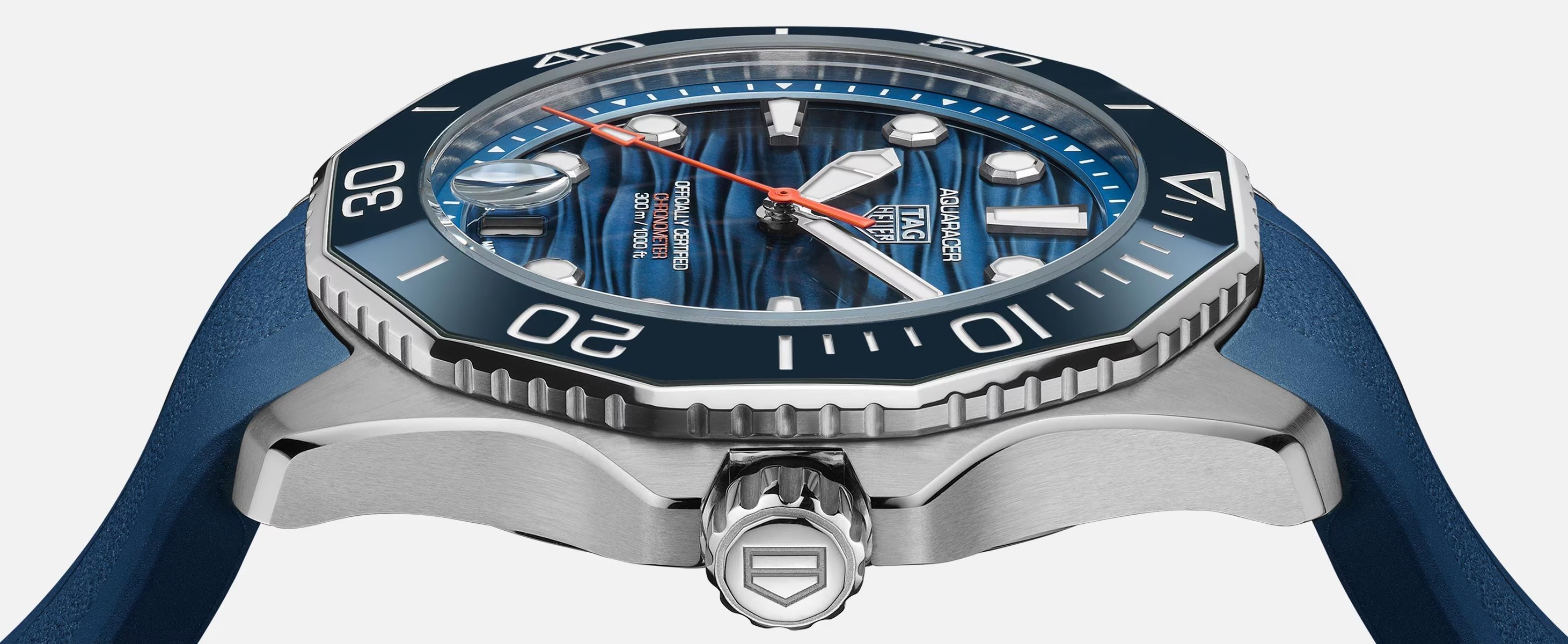 V ponuke značky TAG Heuer nemôžu chýbať potápačské modely. Tie nesú označenie Aquaracer a všetky majú charakteristický dizajn s dvanásťstrannou otočnou lunetou a výraznou korunkou s elegantnou ochranou. V rade Aquaracer nájdeme bohatú paletu modelov, vyberať je možné z mnohých prevedení číselníkov, použitých materiálov a spôsobov spracovania aj radu veľkostí. Modely Aquaracer Professional 200 majú vodotesnosť do 200 metrov a k dispozícii sú s puzdrami s priemerom 30, 34 a 40 milimetrov, sú teda vhodné aj pre užívateľov s menším zápästím. Na výber sú hodinky s quartzovým strojčekom so solárnym pohonom alebo mechanické s automatickým náťahom. Modely Aquaracer Professional 300 sú k dispozícii s oceľovými alebo titánovými puzdrami s priemerom 36, 42 alebo 43 milimetrov. Ako názov napovedá hodinky disponujú vodotesnosťou 300 metrov. Na špičke radu potom stojí titánový model Aquaracer Professional 1000 Superdiver s vodotesnosťou 1000 metrov.