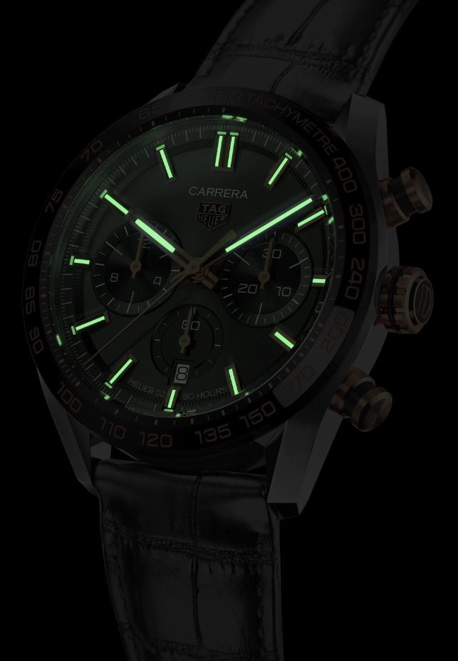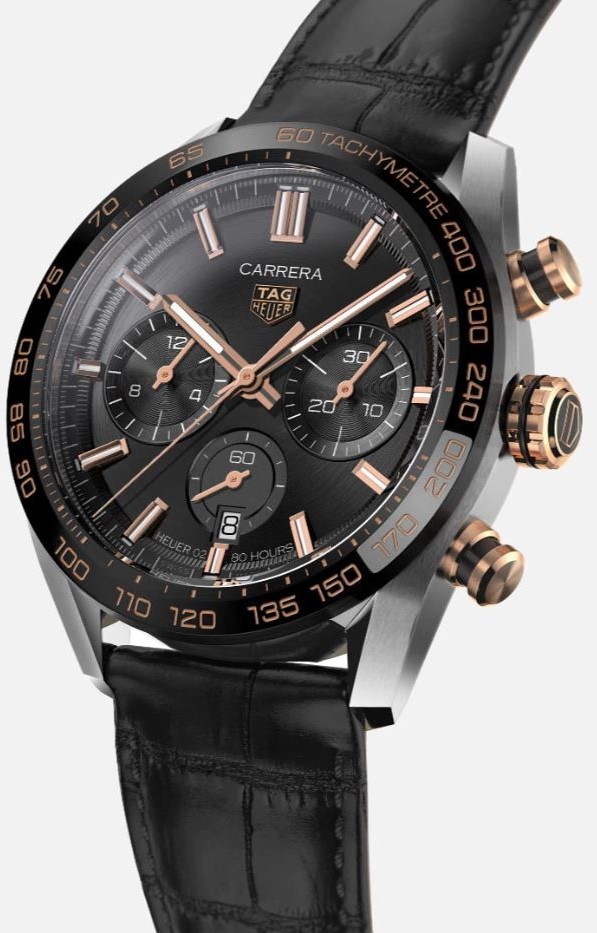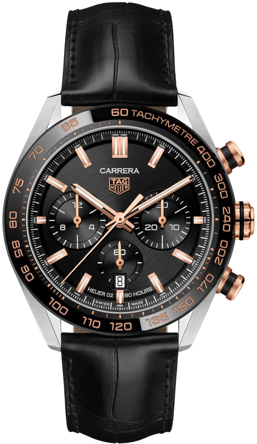 Tag Heuer Carrera Chronograph CBN2A5A.FC6481 sú pánske luxusné športové automatické hodinky na čiernom remienku z aligátora kože s preklápacou sponou. Puzdro z nerezovej ocele má priemer 44 milimetrov, lunetu s čiernou keramickou vložkou s tachymetrickou stupnicou a priehľadné viečko ponúkajúce pohľad na strojček dekorovaný ženevskými pruhmi. Korunka a tlačidlá chronografu sú pozlátené 18 karátovým ružovým zlatom. Čierny číselník s efektom slnečného brúsu, ukazovateľom dátumu, dvoma sčítačmi stopiek a priebežnou sekundovou rúčkou je chránený odolným zafírovým sklom. Ručičky a indexy sú ošetrené náterom Super-LumiNova®, ktorý garantuje perfektnú čitateľnosť za zhoršených svetelných podmienok. Pohon zaisťuje švajčiarsky manufaktúrny mechanický stroj Heuer 02 s automatickým náťahom a rezervou chodu 80 hodín. S vodotesnosťou 10 ATM sú hodinky vhodné na plávanie a šnorchlovanie.