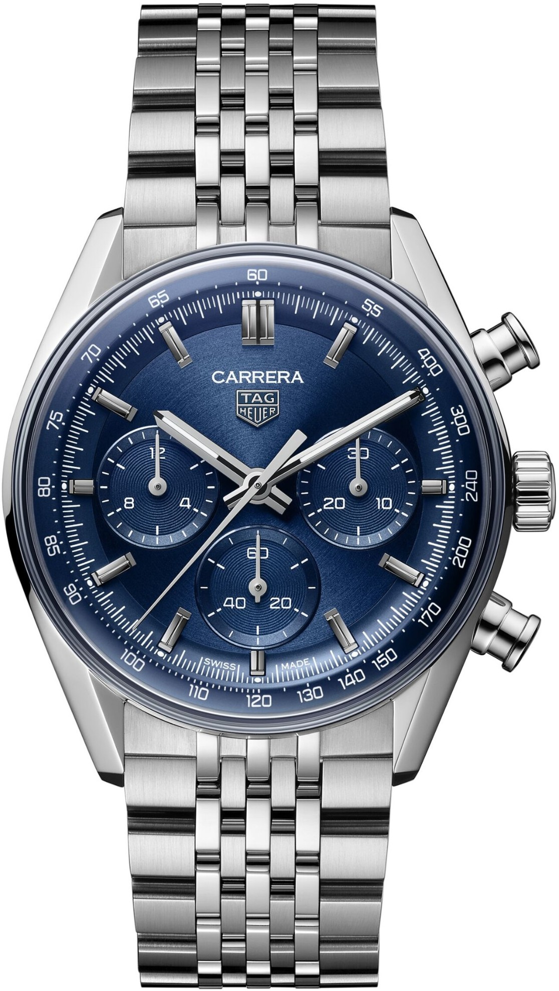 Tag Heuer Carrera Chronograph CBS2113.BA0053 sú pánske luxusné športové automatické hodinky na oceľovom náramku s motýlikovou sponou. Puzdro z nerezovej ocele má priemer 41 milimetrov a priehľadné viečko ponúkajúce pohľad na strojček dekorovaný ženevskými pruhmi. Modrý číselník s efektom slnečného brusu, ukazovateľom dátumu a subciferníkmi stopiek je chránený odolným zafírovým sklom. Ručičky a body pri indexoch sú ošetrené náterom Super-LumiNova®, ktorý garantuje perfektnú čitateľnosť za zhoršených svetelných podmienok. Pohon zaisťuje švajčiarsky manufaktúrny mechanický strojček TH20-01 s automatickým náťahom a rezervou chodu 80 hodín. S vodotesnosťou 10 ATM sú hodinky vhodné na plávanie a šnorchlovanie.
