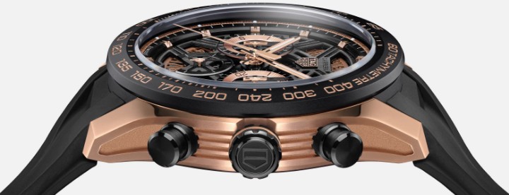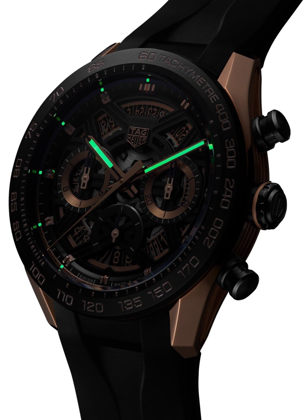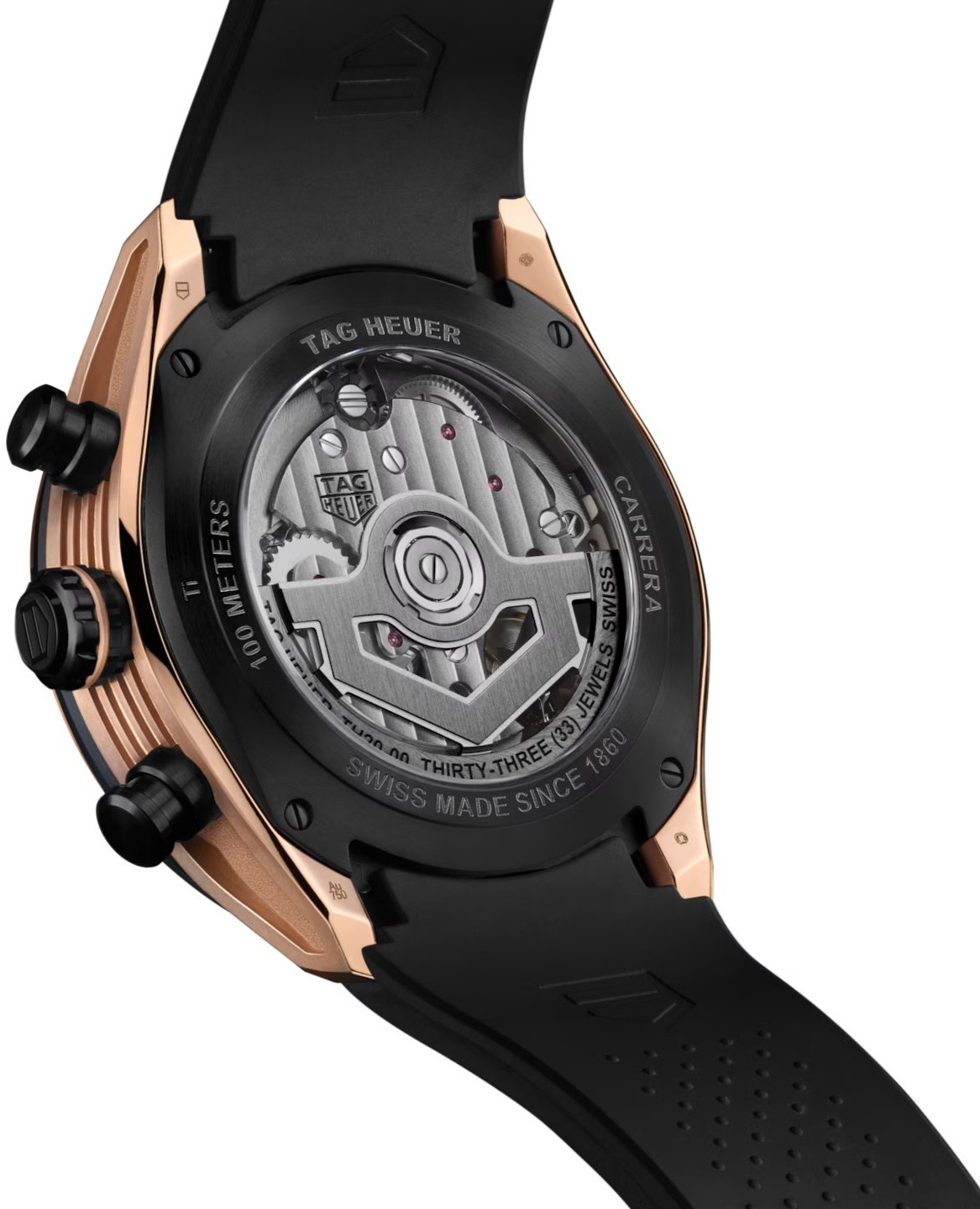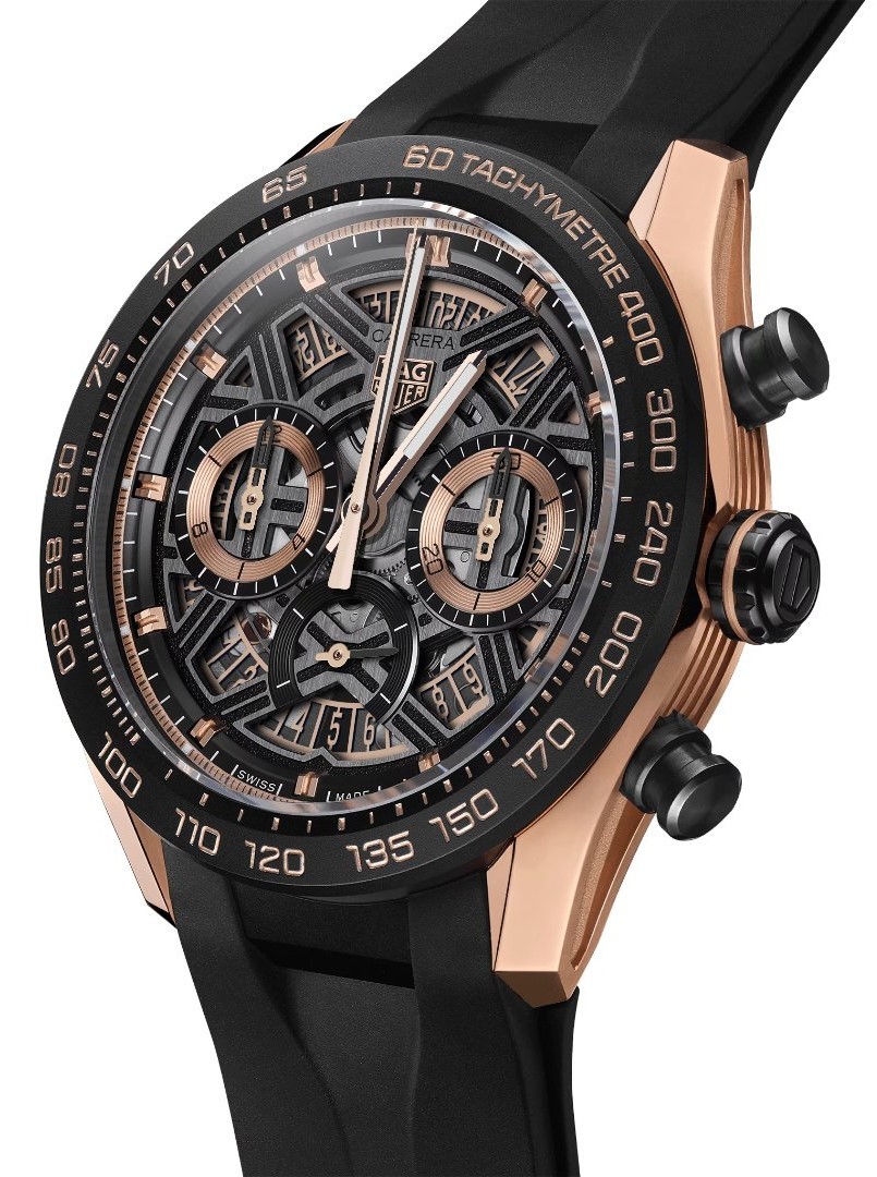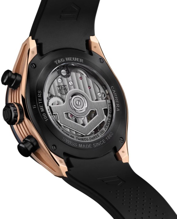 Tag Heuer Carrera Chronograph Extreme Sport CBU2050.FT6273 sú pánske luxusné športové automatické hodinky na čiernom kaučukovom remienku s preklápacou sponou. Puzdro z 18 karátového ružového zlata a titánu s povrchovou DLC úpravou v čiernej farbe má priemer 44 milimetrov, lunetu s keramickou vložkou s tachymetrickou stupnicou a priehľadné viečko ponúkajúce pohľad na strojček dekorovaný ženevskými pruhmi. Čierny skeletónový číselník s ukazovateľom dátumu, dvoma sčítačmi stopiek a priebežnou sekundovou rúčkou je chránený odolným zafírovým sklom. Ručičky a body pri indexoch sú ošetrené náterom Super-LumiNova®, ktorý garantuje perfektnú čitateľnosť za zhoršených svetelných podmienok. Pohon zaisťuje švajčiarsky manufaktúrny mechanický strojček TH20-00 s automatickým náťahom a rezervou chodu 80 hodín. S vodotesnosťou 10 ATM sú hodinky vhodné na plávanie a šnorchlovanie.