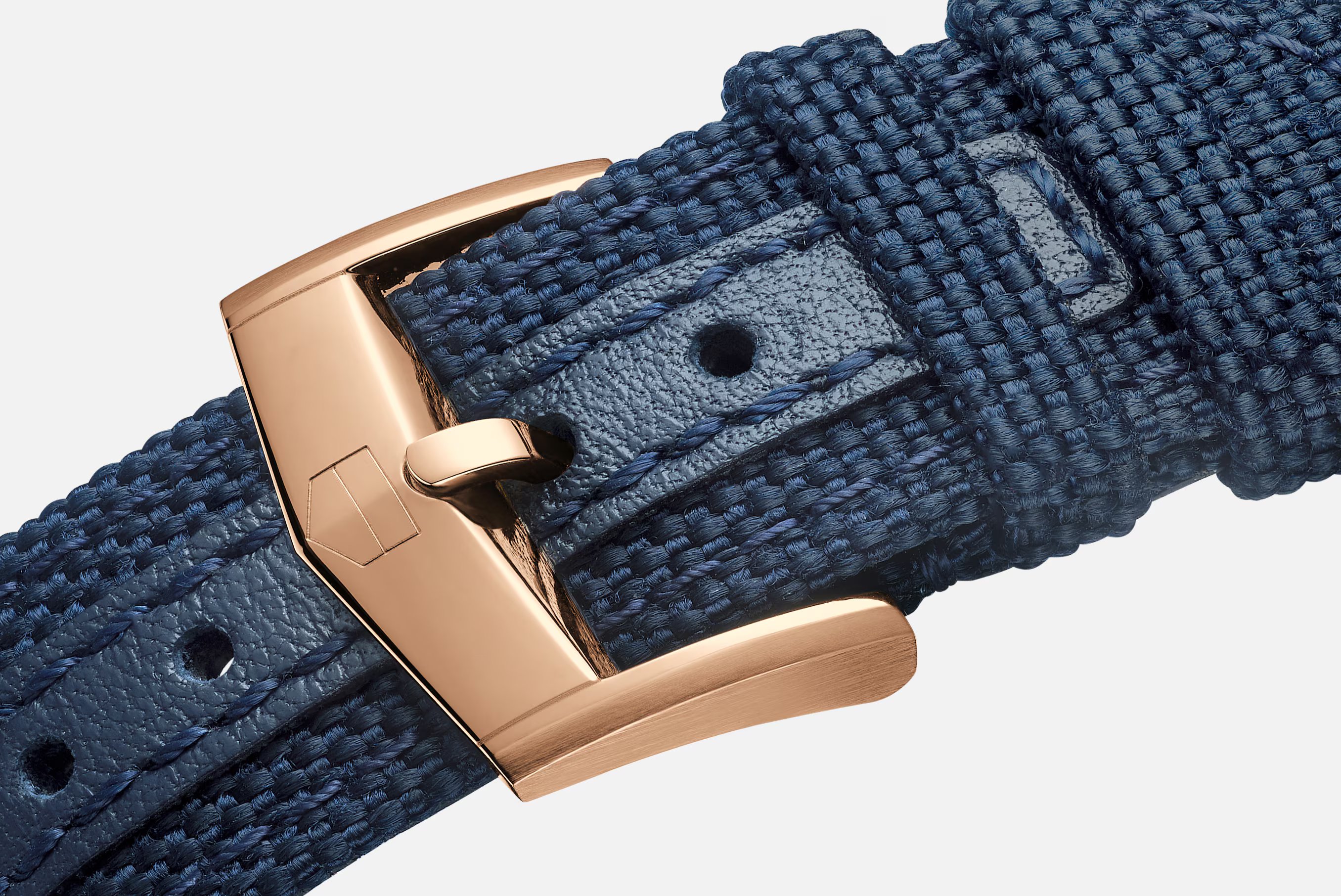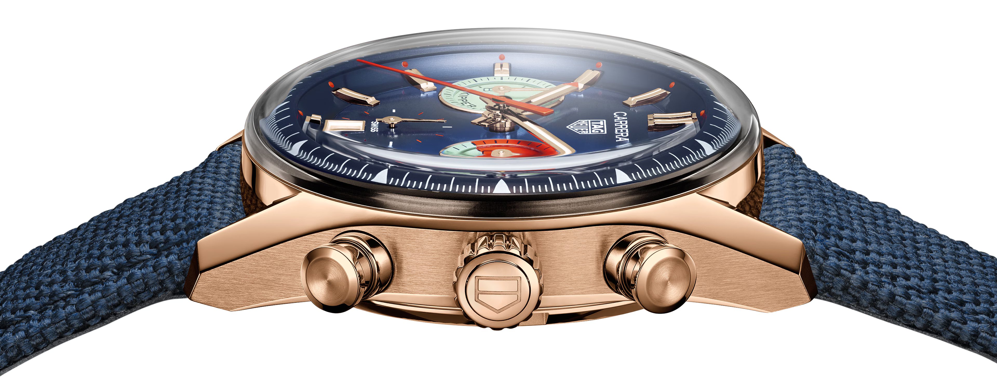 Tag Heuer Carrera Chronograph Skipper CBS2241.FN8023 sú pánske luxusné športové automatické hodinky na modrom textilnom remienku so zlatou tŕňovou sponou. Puzdro z 18 karátového ružového zlata má priemer 39 milimetrov a priehľadné viečko ponúkajúce pohľad na strojček dekorovaný ženevskými pruhmi. Modrý kartáčovaný číselník s efektom slnečného brusu, ukazovateľom dátumu, dvoma sčítačmi stopiek a priebežnou sekundovou rúčkou je chránený odolným zafírovým sklom s antireflexnou vrstvou. Ručičky a body pri indexoch sú ošetrené náterom Super-LumiNova®, ktorý garantuje perfektnú čitateľnosť za zhoršených svetelných podmienok. Pohon zaisťuje švajčiarsky manufaktúrny mechanický strojček TH20-06 s automatickým náťahom a rezervou chodu 80 hodín. S vodotesnosťou 10 ATM sú hodinky vhodné na plávanie a šnorchlovanie.
