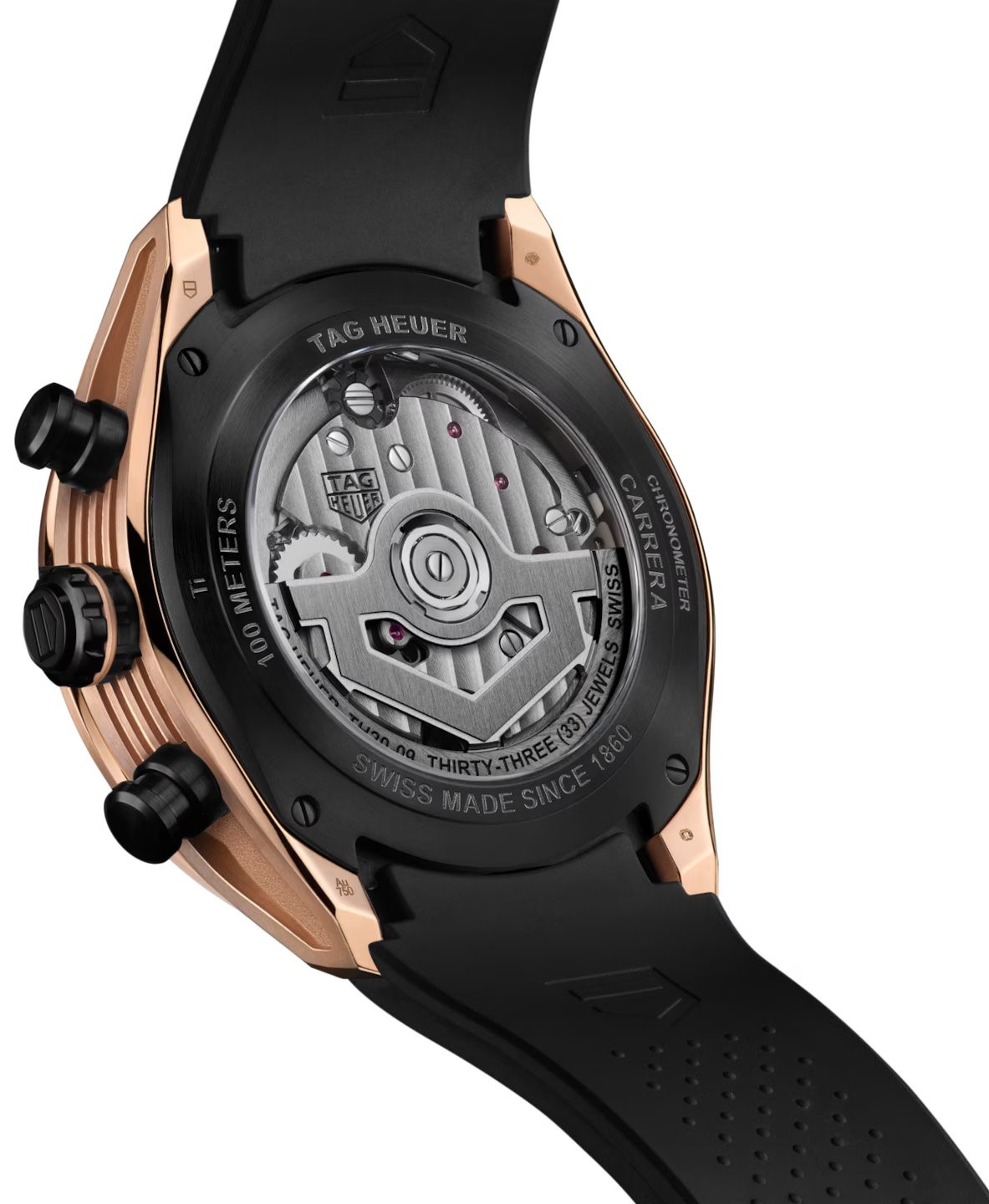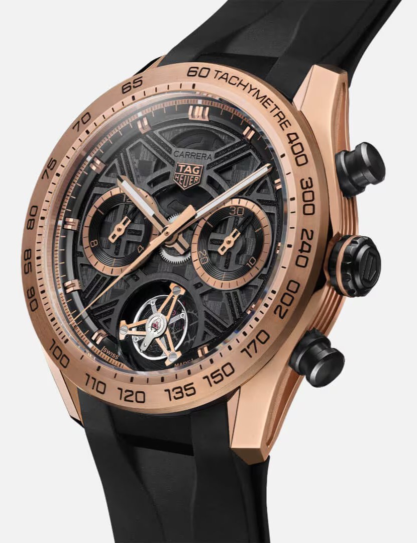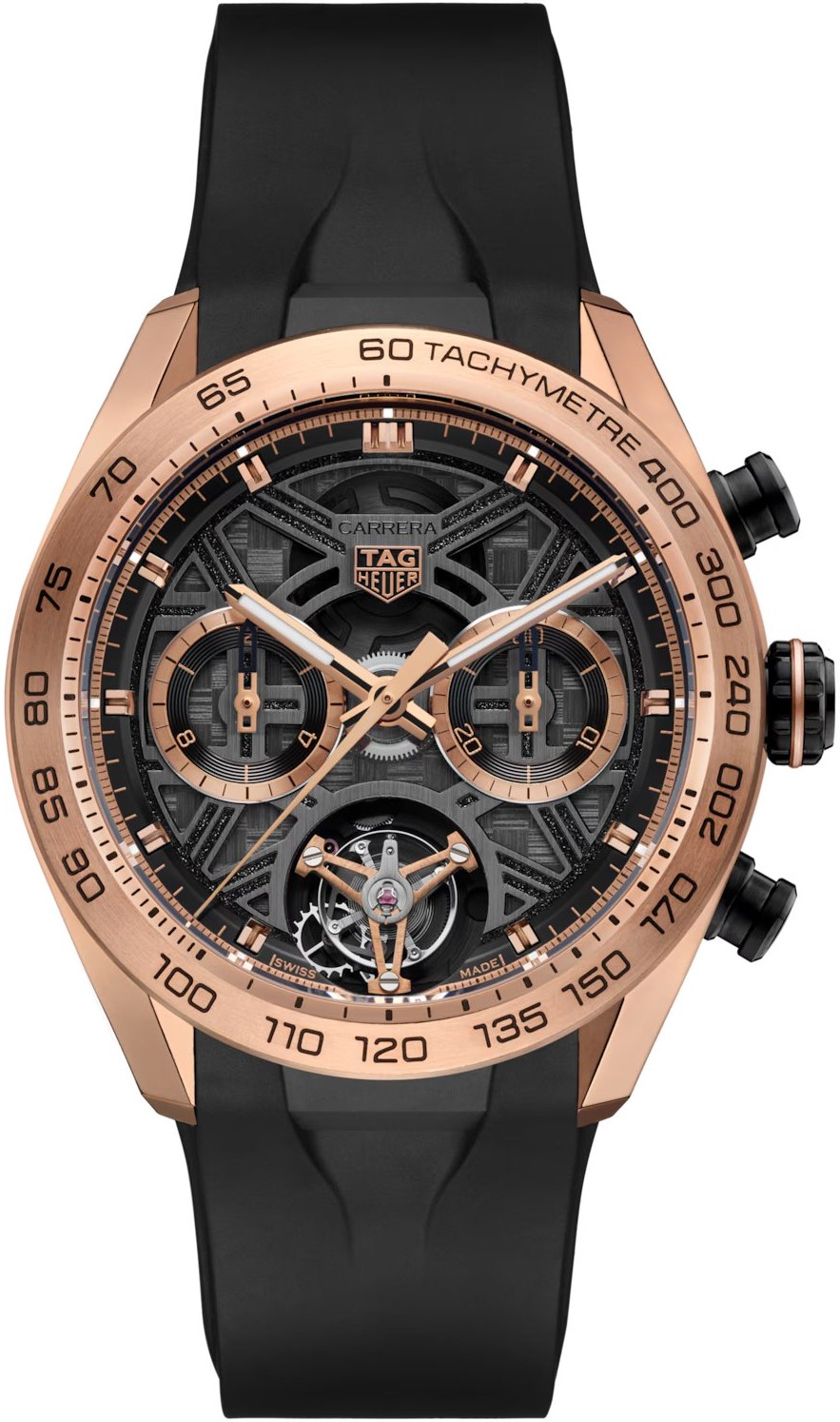Tag Heuer Carrera Chronograph Tourbillon Extreme Sport CBU5050.FT6273 sú pánske luxusné športové automatické hodinky na čiernom kaučukovom remienku s preklápacou sponou. Puzdro z 18 karátového zlata a titánu má priemer 44 milimetrov, lunetu s tachymetrickou stupnicou a priehľadné viečko ponúkajúci pohľad na strojček dekorovaný ženevskými pruhmi. Čierny skeletónový číselník s dvoma sčítačmi stopiek a priehľadom na zotrvačku vo vyhotovení kráľovskej komplikácie „Tourbillon“ je chránený odolným zafírovým sklom. Tourbillon, ktorý sa v rámci šesťdesiatich sekúnd celý otočí okolo vlastnej osi, strojčeku prepožičiava vyššiu presnosť, pretože svojim pohybom eliminuje vplyv gravitácie na zotrvačku. Ručičky a body pri indexoch sú ošetrené náterom Super-LumiNova®, ktorý garantuje perfektnú čitateľnosť za zhoršených svetelných podmienok. Pohon zaisťuje švajčiarsky manufaktúrny mechanický stroj TH20-09 s automatickým náťahom a rezervou chodu 65 hodín. Hodinky sC.O.S.C. certifikáciou, ktorá je zárukou vysokej presnosti, nesú označenie „Chronometer“. S vodotesnosťou 10 ATM sú hodinky vhodné na plávanie a šnorchlovanie.