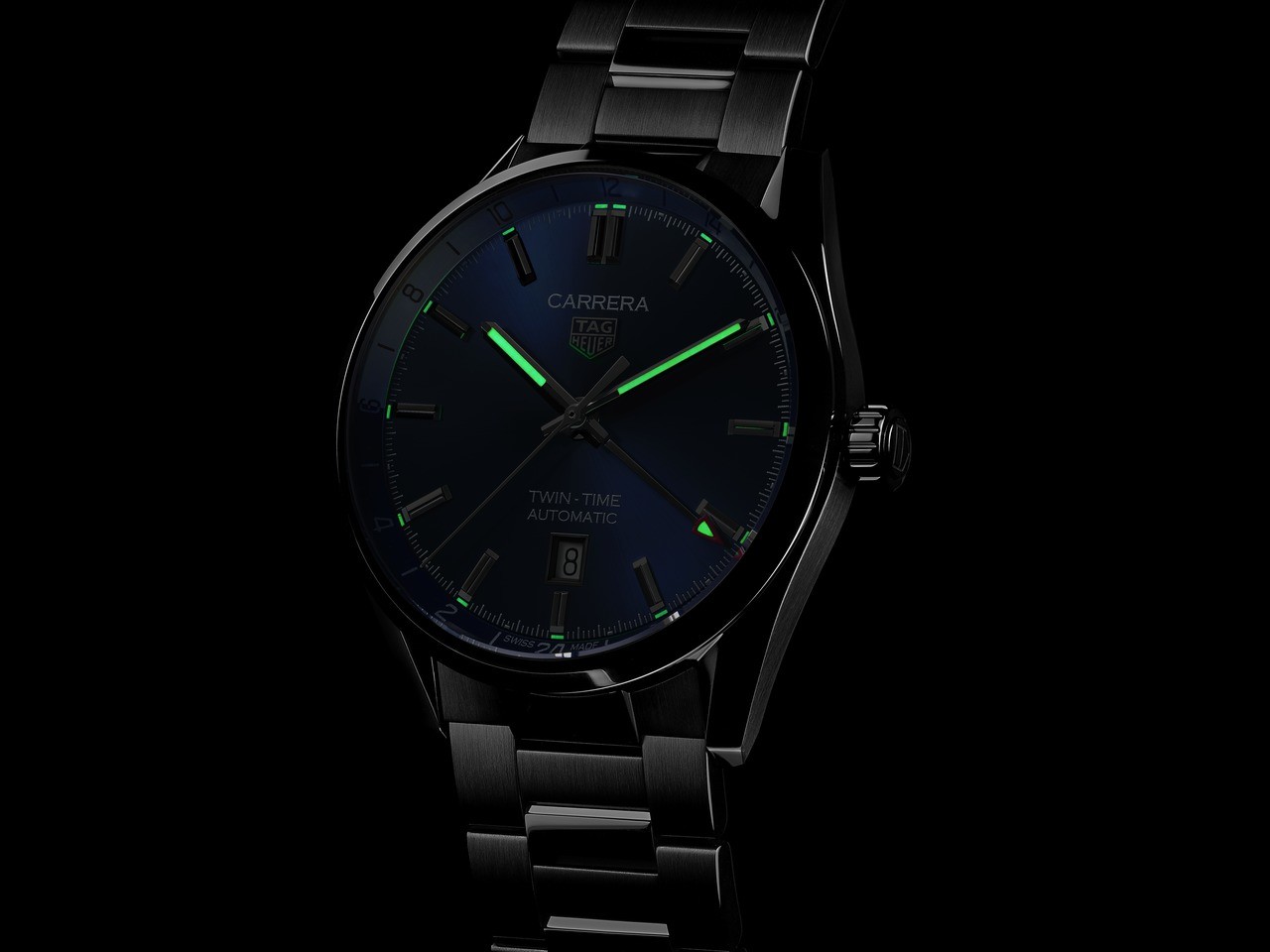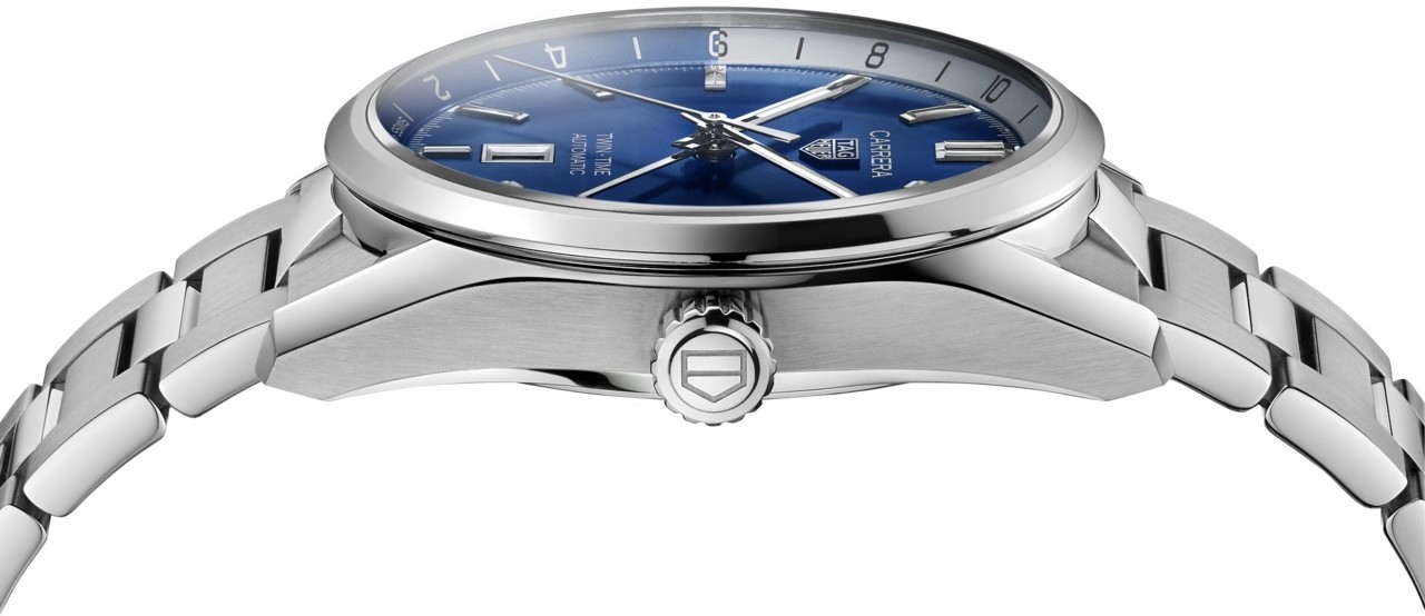 Tag Heuer Carrera Twin-Time WBN201A.BA0640 sú pánske luxusné automatické hodinky na oceľovom náramku s preklápacou sponou. Puzdro z nerezovej ocele má priemer 41 milimetrov a priehľadné viečko ponúkajúce pohľad na strojček dekorovaný ženevskými pruhmi a perlážou. Tmavomodrý číselník s efektom slnečného brusu, ukazovateľom dátumu na šiestej hodine a vnútornou GMT lunetou s 24-hodinovou stupnicou je chránený odolným zafírovým sklom s antireflexnou vrstvou. Ručičky a aplikované indexy sú ošetrené náterom Super-LumiNova®, ktorý garantuje perfektnú čitateľnosť za zhoršených svetelných podmienok. Pohon zaisťuje švajčiarsky mechanický stroj Calibre 7 s automatickým náťahom a rezervou chodu 50 hodín. S vodotesnosťou 10 ATM sú hodinky vhodné na plávanie a šnorchlovanie.