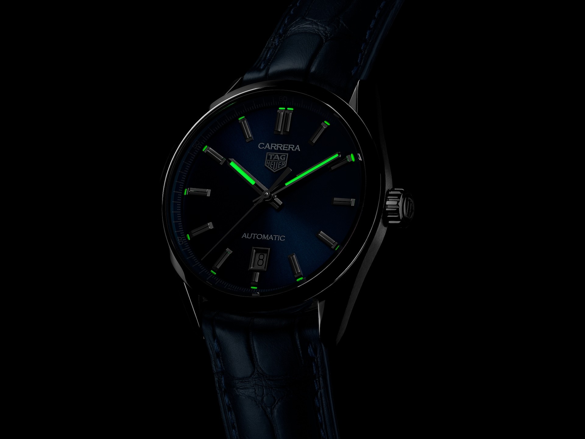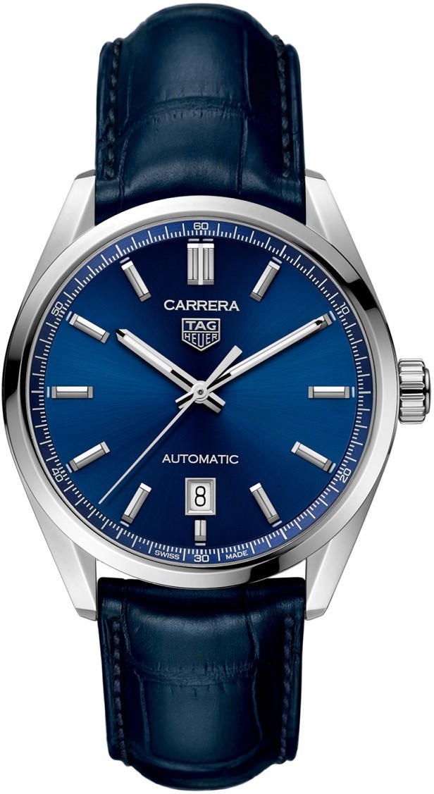 Tag Heuer Carrera WBN2112.FC6504 sú pánske elegantné automatické hodinky na modrom remienku z aligátora kože s preklápacou sponou. Puzdro z nerezovej ocele má priemer 39 milimetrov a priehľadné viečko ponúkajúce pohľad na strojček dekorovaný ženevskými pruhmi a perlážou. Tmavomodrý číselník s efektom slnečného brusu a ukazovateľom dátumu na šiestej hodine je chránený odolným zafírovým sklom s antireflexnou vrstvou. Ručičky a aplikované indexy sú ošetrené náterom Super-LumiNova®, ktorý garantuje perfektnú čitateľnosť za zhoršených svetelných podmienok. Pohon zaisťuje švajčiarsky mechanický stroj Calibre 5 s automatickým náťahom a rezervou chodu 38 hodín. S vodotesnosťou 10 ATM sú hodinky vhodné na plávanie a šnorchlovanie.