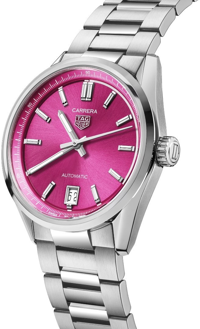 Tag Heuer Carrera WBN2313.BA0001 sú dámske hodinky v klasickom štýle na oceľovom náramku s preklápacou sponou. Puzdro z nerezovej ocele má priemer 36 milimetrov a priehľadné viečko ponúkajúce pohľad na strojček dekorovaný ženevskými pruhmi a perlážou. Ružový číselník s efektom slnečného brusu a ukazovateľom dátumu na šiestej hodine je chránený odolným zafírovým sklom s antireflexnou vrstvou. Ručičky a aplikované indexy sú ošetrené náterom Super-LumiNova®, ktorý garantuje perfektnú čitateľnosť za zhoršených svetelných podmienok. Pohon zaisťuje švajčiarsky mechanický stroj Calibre 7 s automatickým náťahom a rezervou chodu 56 hodín. S vodotesnosťou 5 ATM sú hodinky odolné proti dažďu a pri sprchovaní.