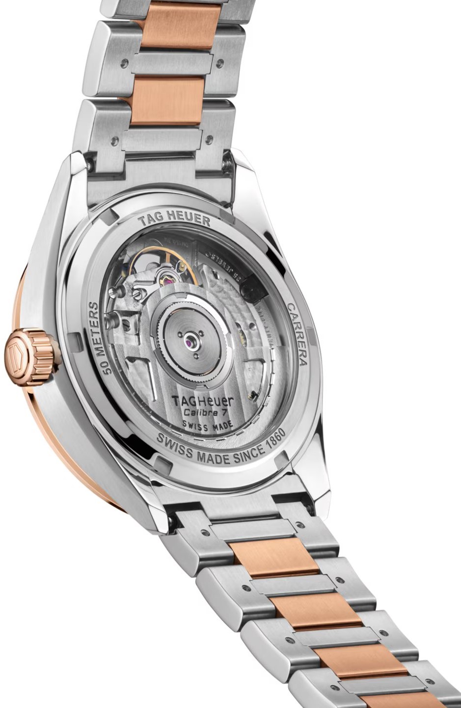 Tag Heuer Carrera WBN2350.BD0000 sú dámske luxusné automatické hodinky na náramku z ocele a ružového zlata s preklápacou sponou. Puzdro z nerezovej ocele má priemer 36 milimetrov a priehľadné viečko ponúkajúce pohľad na strojček dekorovaný ženevskými pruhmi a perlážou. Luneta a korunka sú rovnako ako niektoré dieliky náramku vyrobené z 18 karátového ružového zlata. Číselník vo farbe ružového zlata s efektom slnečného brusu a ukazovateľom dátumu na šiestej hodine je chránený odolným zafírovým sklom s antireflexnou vrstvou. Ručičky a aplikované indexy sú ošetrené náterom Super-LumiNova®, ktorý garantuje perfektnú čitateľnosť za zhoršených svetelných podmienok. Pohon zaisťuje švajčiarsky mechanický stroj Calibre 7 s automatickým náťahom a rezervou chodu 56 hodín. S vodotesnosťou 5 ATM sú hodinky odolné proti dažďu a pri sprchovaní.