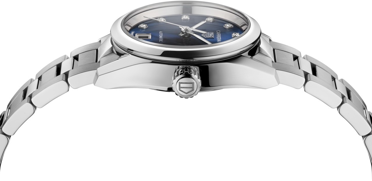Tag Heuer Carrera WBN2413.BA0621 sú dámske luxusné automatické hodinky v klasickom štýle na oceľovom náramku s preklápacou sponou. Puzdro z nerezovej ocele má priemer 29 milimetrov a priehľadné viečko ponúkajúce pohľad na strojček dekorovaný ženevskými pruhmi a perlážou. Modrý číselník s efektom slnečného brúsu, 11 diamantmi s hmotnosťou 0,089 ct a ukazovateľom dátumu na šiestej hodine je chránený odolným zafírovým sklom s antireflexnou vrstvou. Ručičky sú ošetrené náterom Super-LumiNova®, ktorý garantuje perfektnú čitateľnosť za zhoršených svetelných podmienok. Pohon zaisťuje švajčiarsky mechanický stroj Calibre 9 s automatickým náťahom a rezervou chodu 40 hodín. S vodotesnosťou 10 ATM sú hodinky vhodné na plávanie a šnorchlovanie.